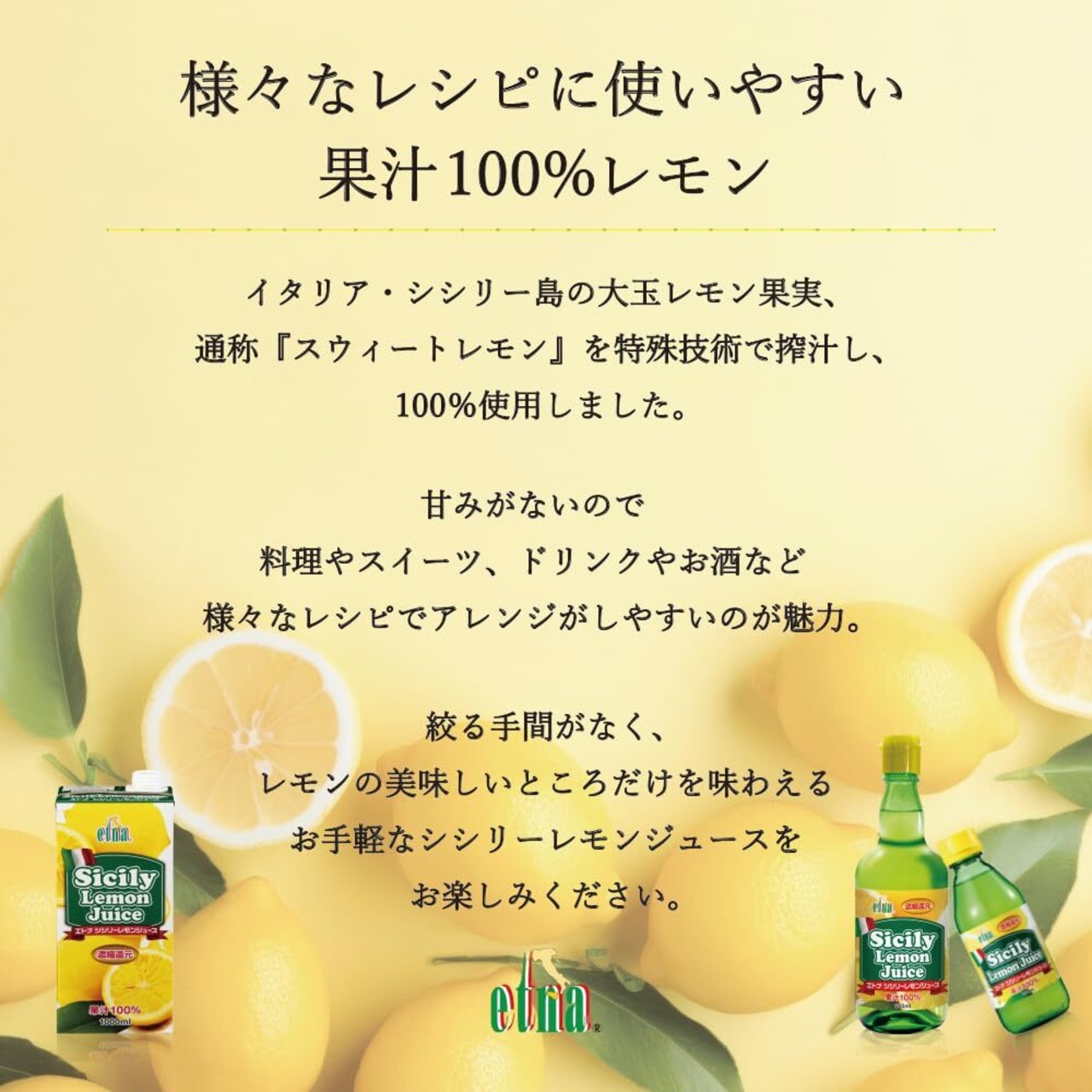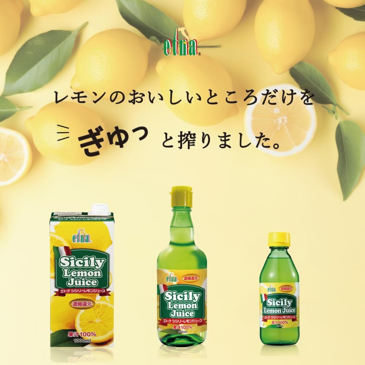 イタリア・シシリー島の大玉レモン果実、通称スイートレモンを特殊技術で搾汁し100%使用しました。