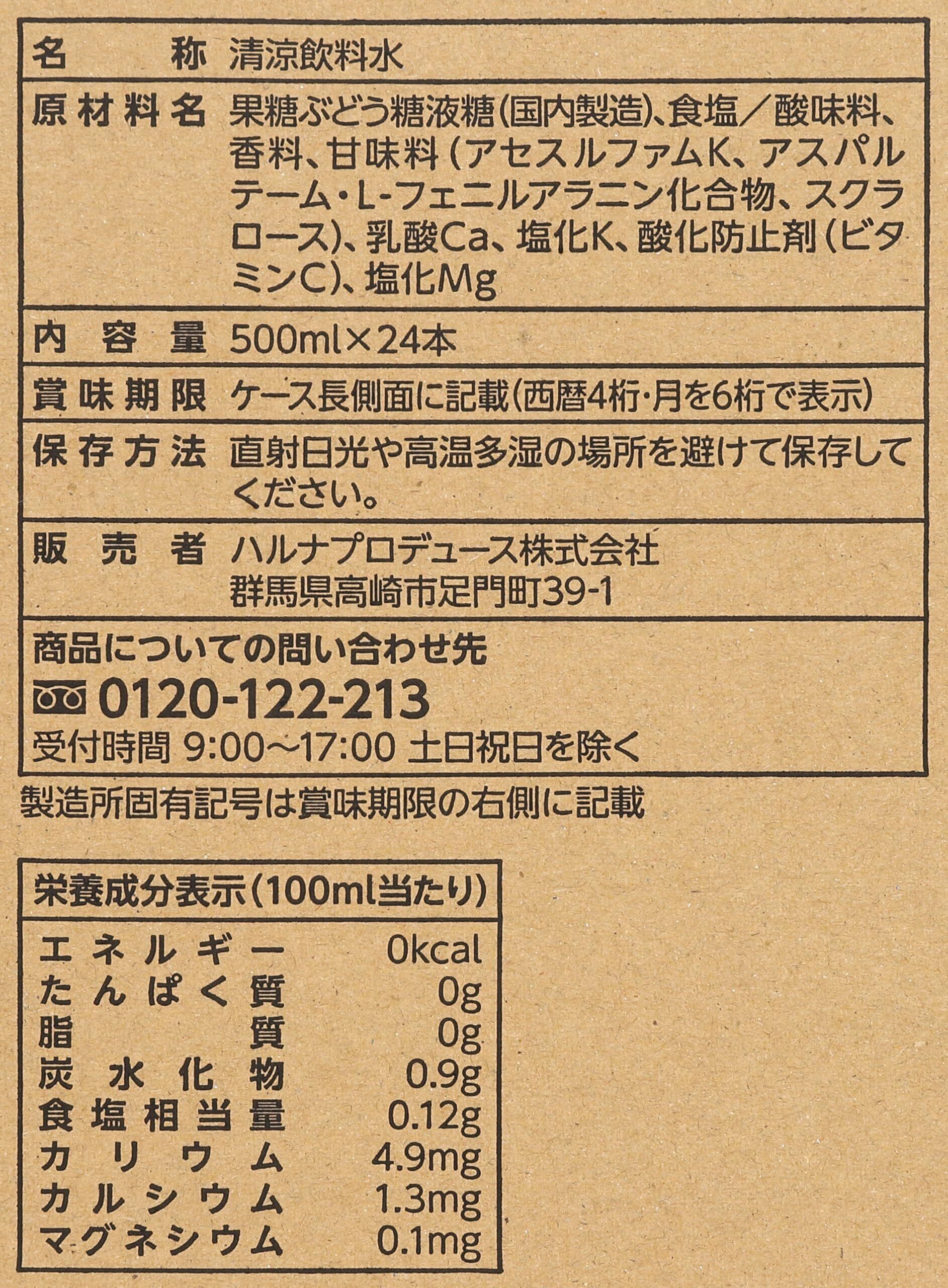 果糖ぶどう糖液糖(国内製造)、食塩/酸味料、香料、甘味料(アセスルファムK、アスパルテーム・L-フェニルアラニン化合物、スクラロース)、乳酸Ca、塩化K、酸化防止剤(ビタミンC)、塩化Mg