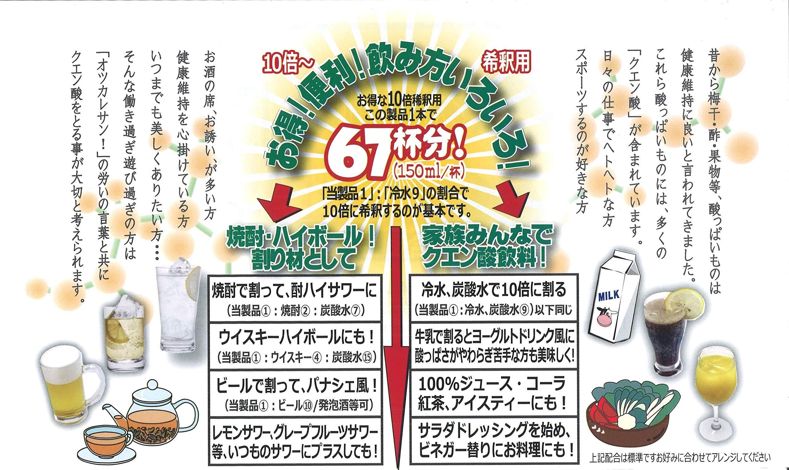 飲食店のプロに人気の高濃度クエン酸飲料/10倍稀釈業務用2本セット。これからの季節体調管理は1日1日の積み重ねですね。お得な業務用だから1本で「グラス200cc×50杯分」です。クエン酸は梅干約400個分配合されてます。(グラス1杯に梅干約8個分のクエン酸が配合されています。)