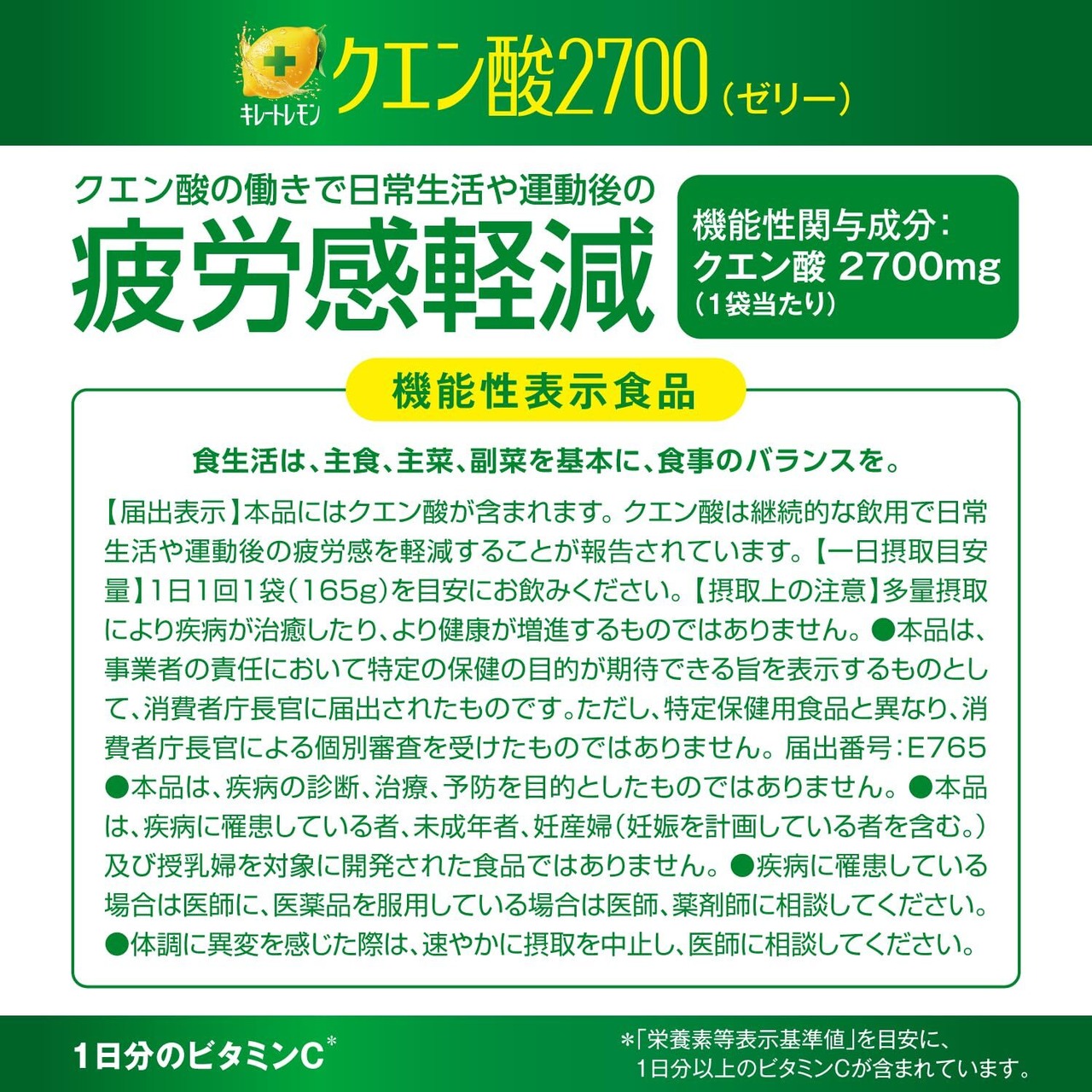 レモン1個分の果汁、1日分のビタミンC、すばやくエネルギーになるブドウ糖、 継続的な飲用で日常生活や運動後の疲労感を軽減するクエン酸(機能性関与成分)が2700mg入った「機能性表示食品のレモンゼリー」
