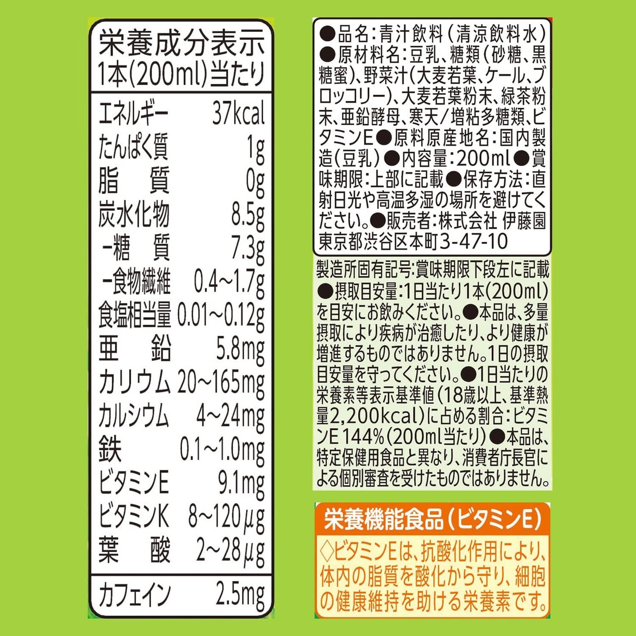 原材料:豆乳、糖類(砂糖、黒糖蜜)、野菜汁(大麦若葉、ケール、ブロッコリー)、大麦若葉粉末、緑茶粉末、亜鉛酵母、寒天/増粘多糖類、ビタミンE 原料原産地名:国内製造(豆乳)