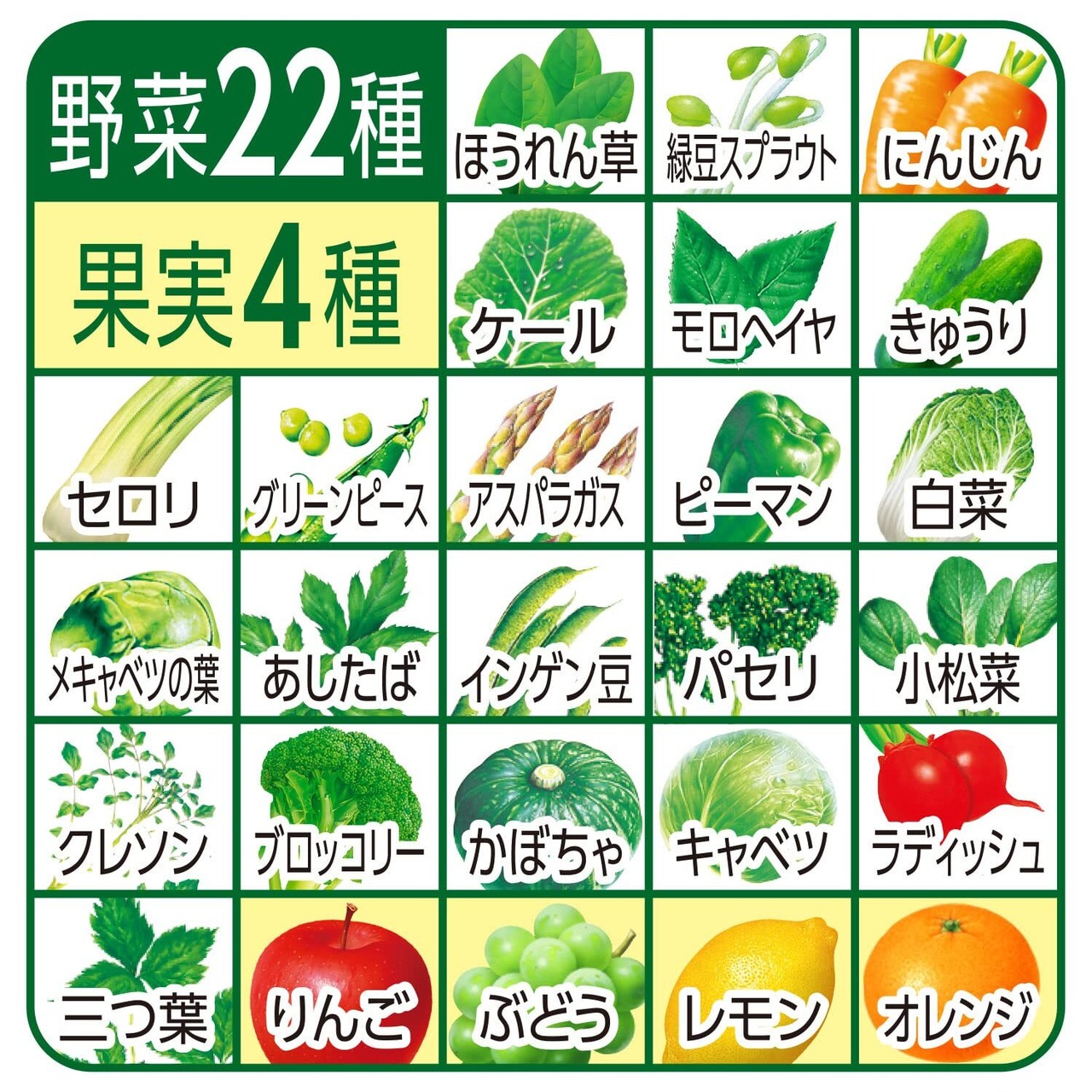 野菜汁(ほうれん草、緑豆スプラウト(もやし)、にんじん、ケール、モロヘイヤ、きゅうり、セロリ、グリーンピース、アスパラガス、ピーマン、白菜、メキャベツの葉、あしたば、インゲン豆、パセリ、小松菜、クレソン、ブロッコリー、かぼちゃ、キャベツ、ラディッシュ、三つ葉)、果汁(りんご、ぶどう、レモン、オレンジ)/香料、ピロリン酸第二鉄、クチナシ色素 原料原産地:ハンガリー又はブラジル又はその他(りんご)
