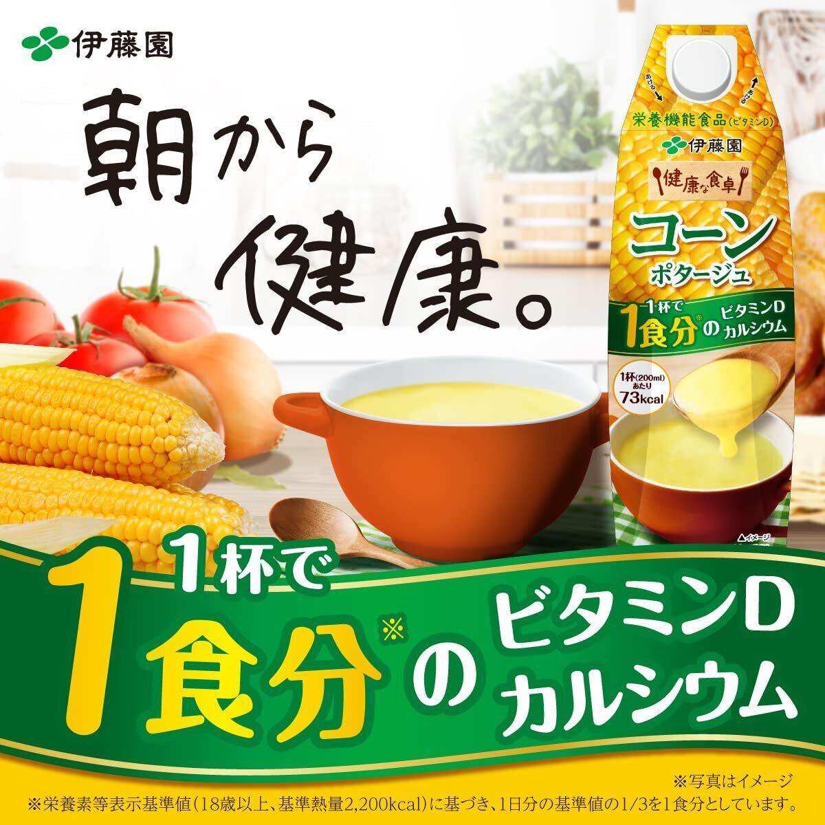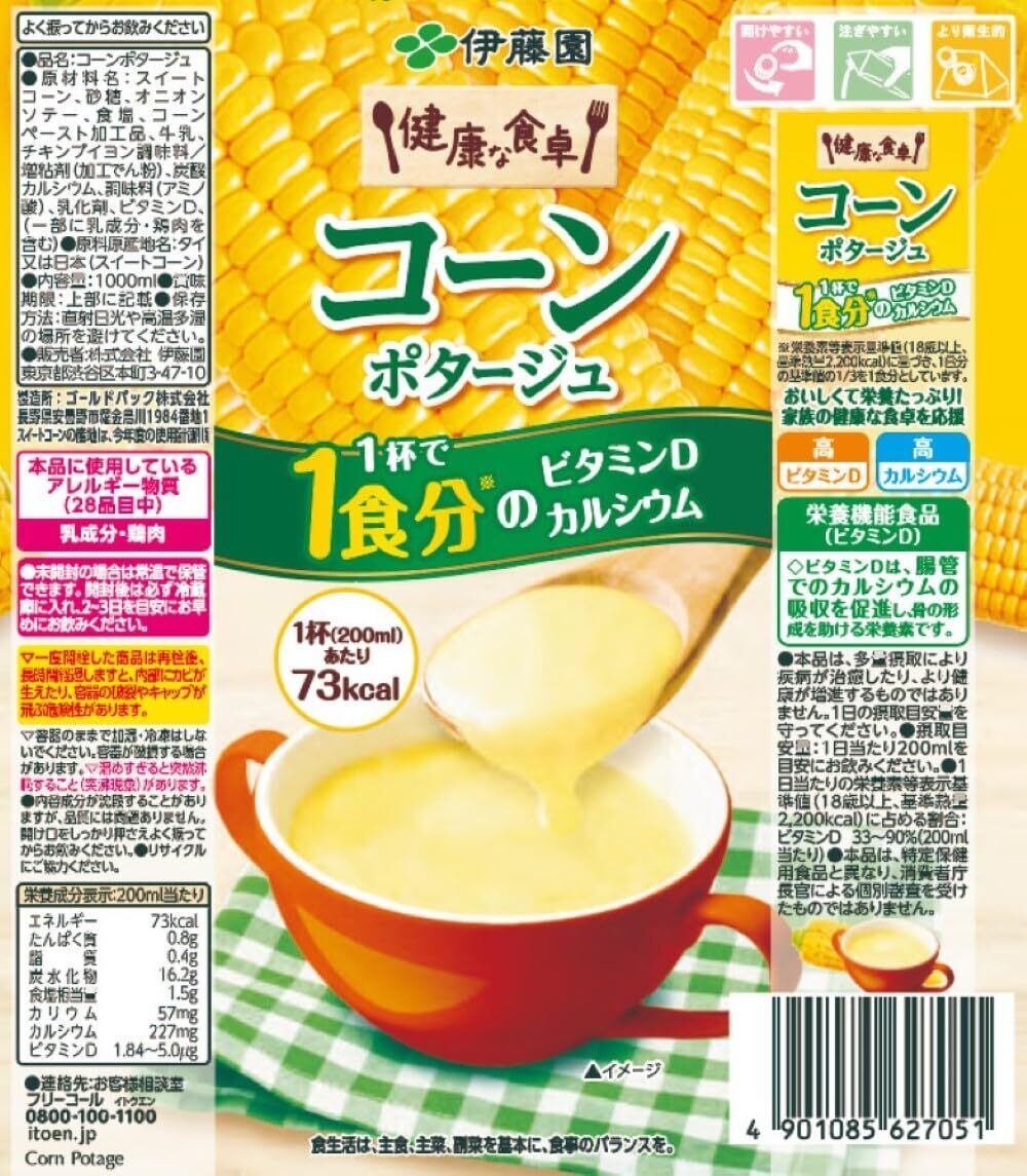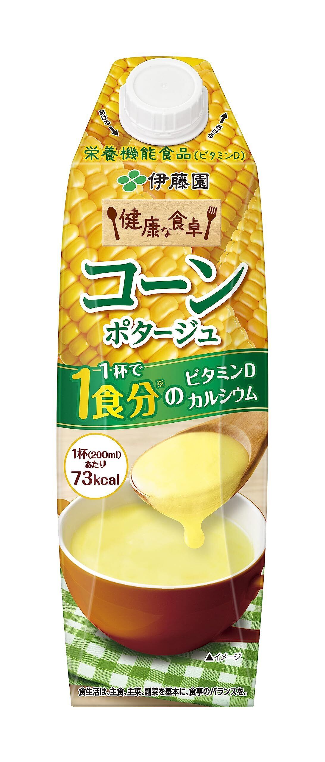 ●おいしく手軽に栄養を! 健康な食卓をサポートする栄養機能食品のコーンポタージュ【栄養のポイント】●1食分※のビタミンDとカルシウムで健康をサポート。(1杯あたり200ml)(ビタミンD:1.84~5.0μg/200ml、カルシウム:227mg/200ml)※栄養素等表示基準値(18歳以上、基準熱量2,200kcal)に基づき、1日分の基準値の1/3を1食分としています。● 栄養機能食品(ビタミンD)ビタミンDは、腸管でのカルシウムの吸収を促進し、骨の形成を助ける栄養素です。【おいしさのポイント】●フレッシュなコーンの甘みと香りを逃さずに詰め込んでいます。● 時間をかけて煮込んだような、コク深い味わいに仕上げました。香料・着色料、食用油脂を原料に使用せずに、手間暇かけて素材のおいしさを引き出し、濃度感のある味わいに仕上げました。キャップ付き容器なので開けやすく、注ぎやすく、衛生的です。■ご注意(アレルギー物質について)本品の原材料には、「乳成分」「鶏肉」が含まれておりますので、アレルギー体質の方は、お飲みにならないでください。■ご注意(栄養機能食品について)●本品は、多量摂取により疾病が治癒したり、より健康が増進するものではありません。1日の摂取目安量を守ってください。●摂取目安量:1日当たり200mlを目安にお飲みください。●1日当たりの栄養素等表示基準値(18歳以上、基準熱量2,200kcal)に占める割合:ビタミンD 33~90%(200ml当たり)●本品は、特定保健用食品と異なり、消費者庁長官による個別審査を受けたものではありません。 原材料・成分 ●原材料:スイートコーン(遺伝子組み換えではない)、砂糖、オニオンソテー、食塩、コーンペースト加工品、牛乳、チキンブイヨン調味料/増粘剤(加工でん粉)、炭酸カルシウム、調味料(アミノ酸)、乳化剤、ビタミンD、(一部に乳成分・鶏肉を含む)●原料原産地名:タイ又は日本(スイートコーン)