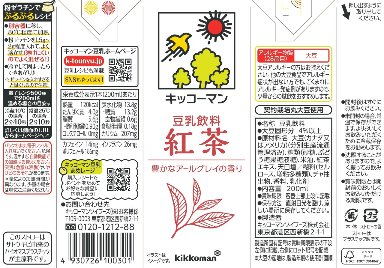 原材料:大豆(カナダ又はアメリカ)(分別生産流通管理済み)、糖類(砂糖、ぶどう糖果糖液糖)、米油、紅茶エキス、天日塩/糊料(セルロース、増粘多糖類)、チャ抽出物、香料、乳化剤