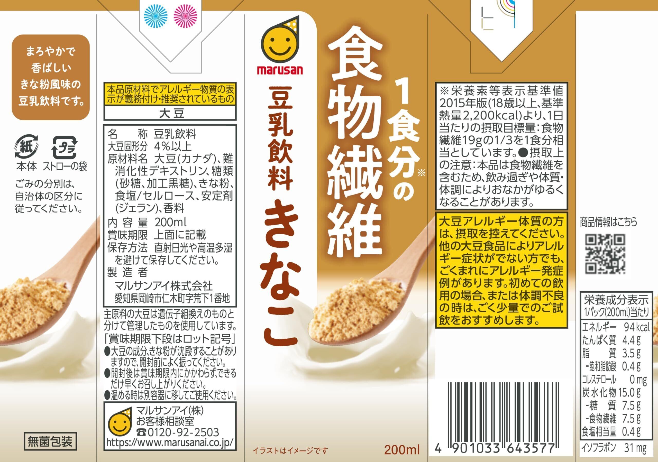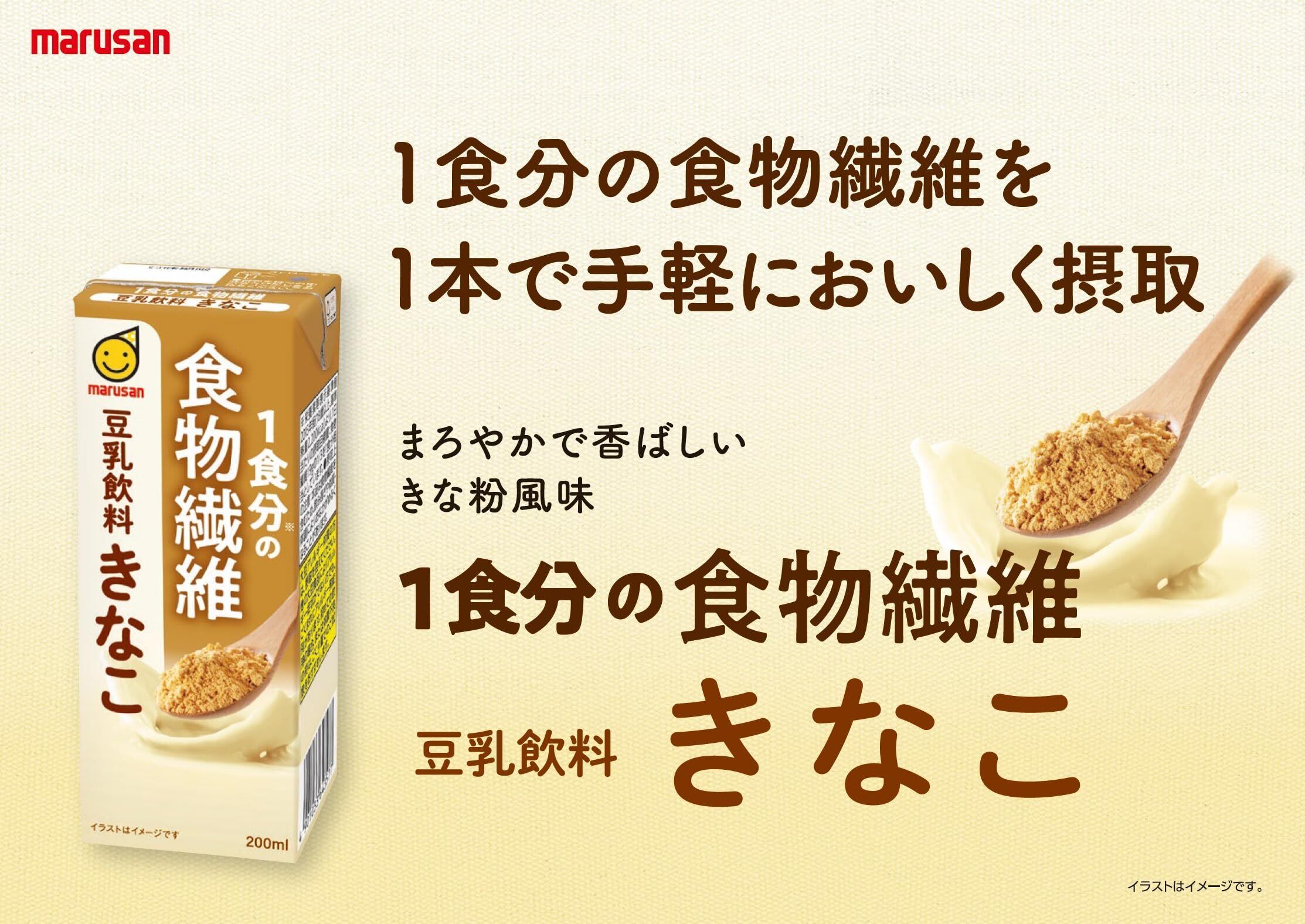 1本(200ml)で1食分(※)の食物繊維を手軽に摂取できる栄養機能食品の豆乳飲料です。※1日当た摂取目安量栄養素表示基準値2015年版(18歳以上基準熱量2,200kcal)より、1日当たりの摂取目標量19gの1/3を1食分相当とする。