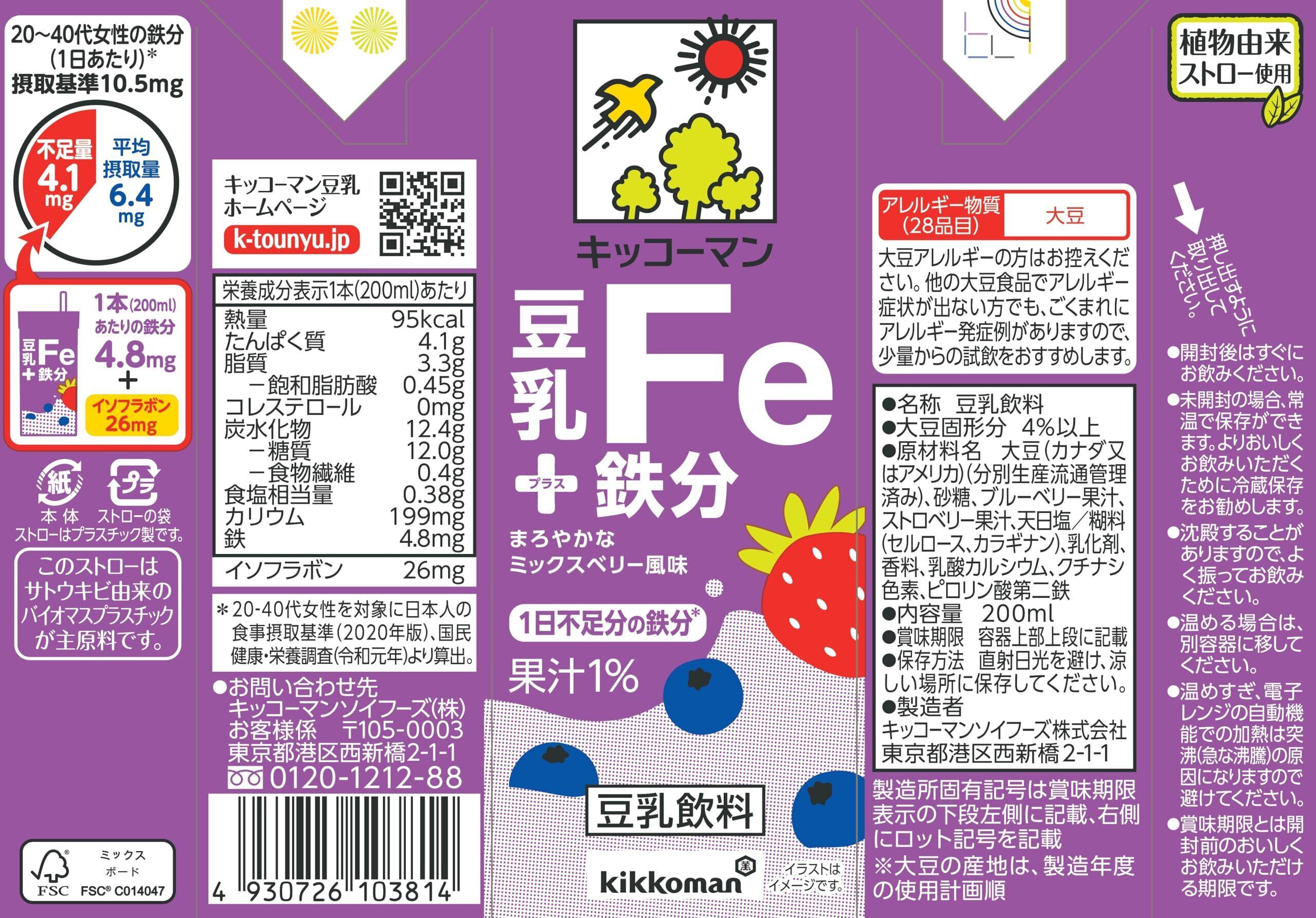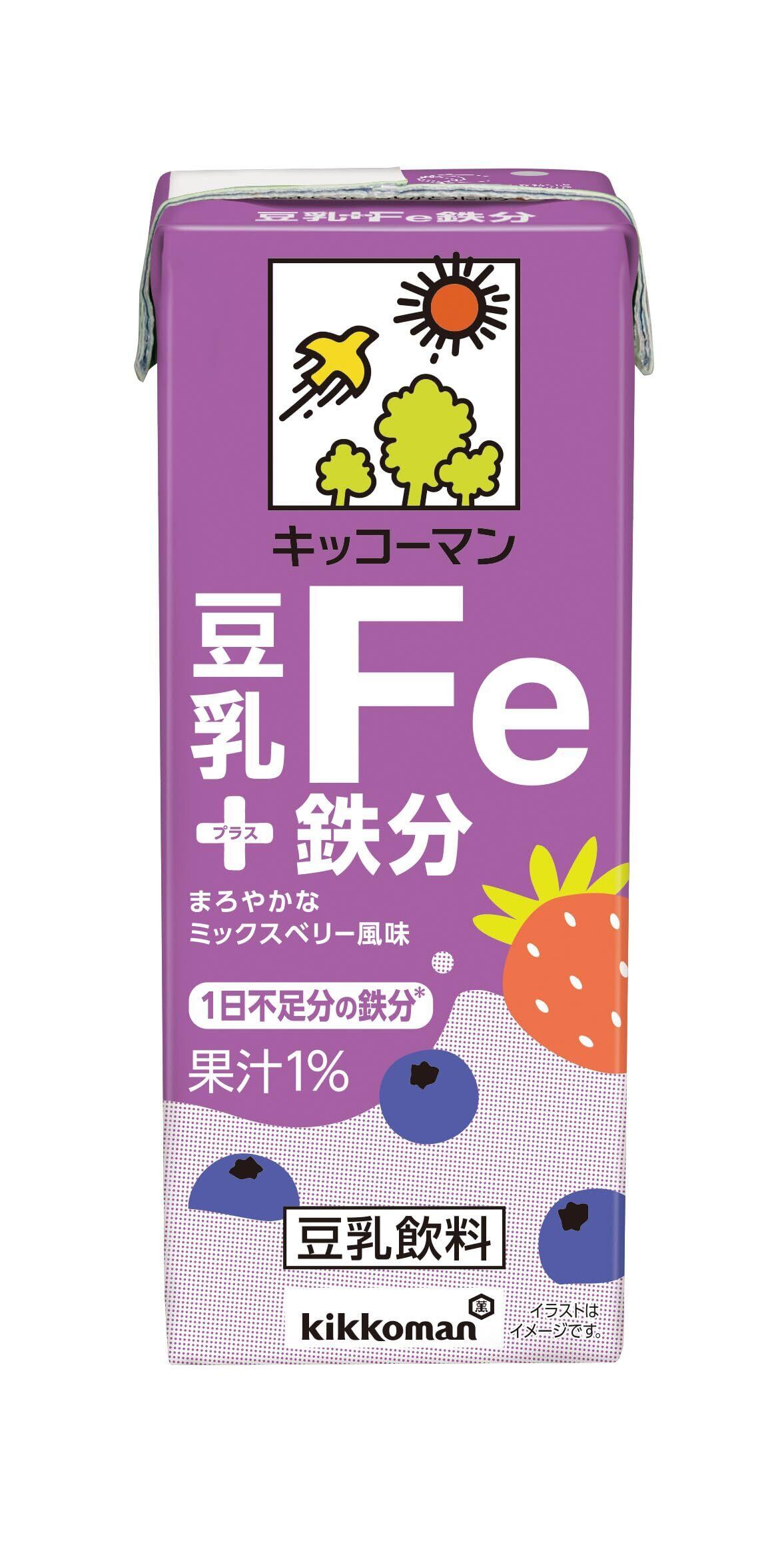 キッコーマンの豆乳は、品質と鮮度にこだわり、大豆の微量栄養成分をより多く抽出し大豆臭の少ない、おいしい味に仕上げています。女性を中心に不足しがちな栄養素「鉄分」を、本商品1本で1日あたりの不足分の鉄分4.8mg※を手軽に補給できます。鉄の風味を抑え、飲みやすさを追求した「まろやかなミックスベリー風味」で、豆乳に含まれる栄養(大豆たんぱく、イソフラボン)も一緒に摂取できます。※20-40代女性対象とした日本人の食事摂取基準(2020年版)及び、国民健康・栄養調査(令和元年)より算出