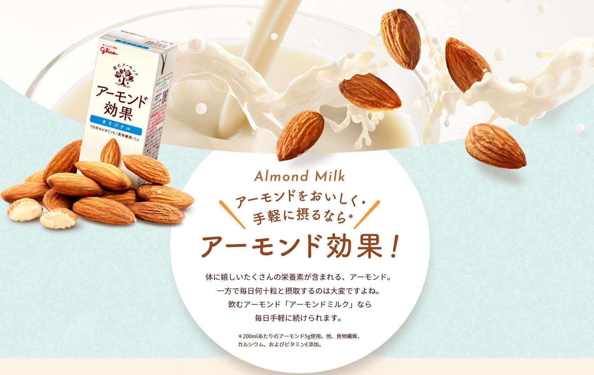 「アーモンド効果」は、ビタミン E(1 日分※)と、たっぷりの食物繊維が摂れるアーモンドミルクです。 ※「栄養素等表示基準値」より