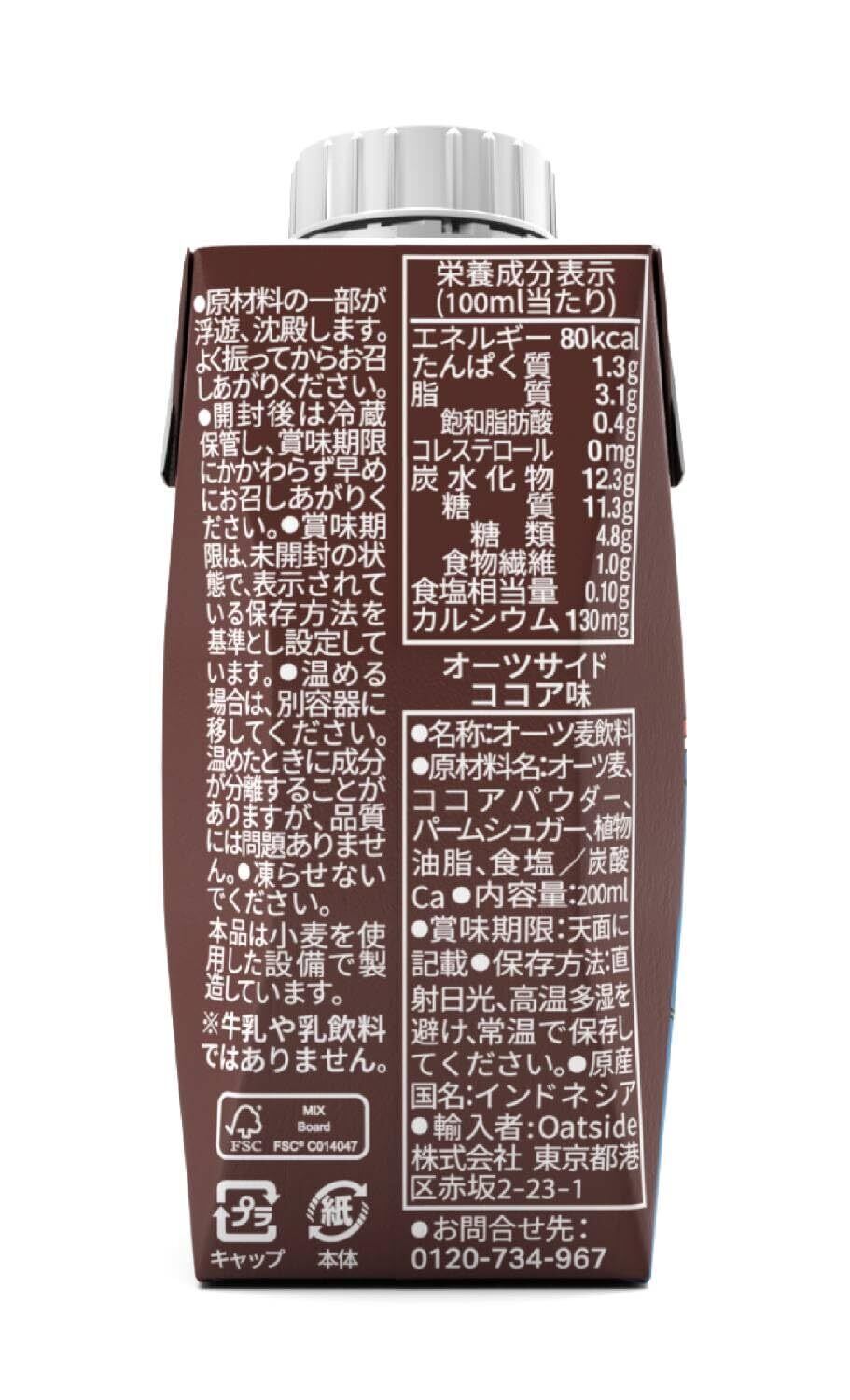 インドネシア産のココアブレンドを使用。甘さ控えめ。お子様も喜ぶココア味のオーツミルク。ラクトースフリー。直射日光、高温多湿を避け、常温で保存してください。開封後は冷蔵保管し、賞味期限にかかわらずお早めにお召しあがりください。よく振ってからお召しあがりください。凍らせないでください。開封後は中身が漏れる場合がありますので、倒さないように注意し、立てて保管してください。牛乳や乳飲料ではありません。