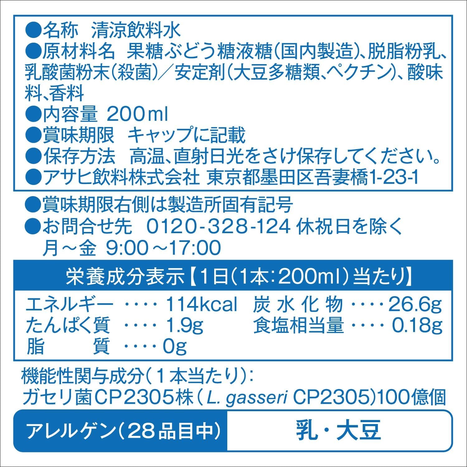 栄養成分表示 1日(1本:200ml)当たりエネルギー114kcal,たんぱく質1.9g,脂質0g,炭水化物26.6g,食塩相当量0.18g,機能性関与成分:ガセリ菌CP2305株(L.gasseri CP2305)100億個