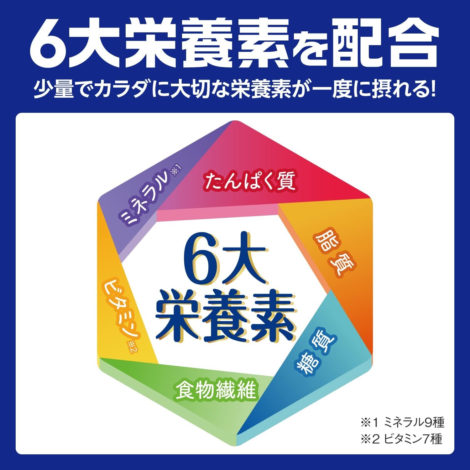 ●体に必要な6大栄養素(たんぱく質、脂質、糖質、食物繊維、ビタミン、ミネラル)をバランスよく配合