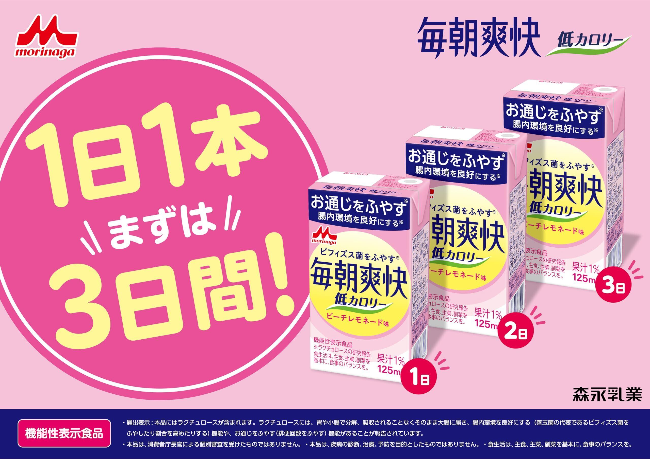 ●「森永 毎朝爽快」シリーズの低カロリータイプ(1本125mlあたり24kcal)。お通じが気になる方にぴったり。
