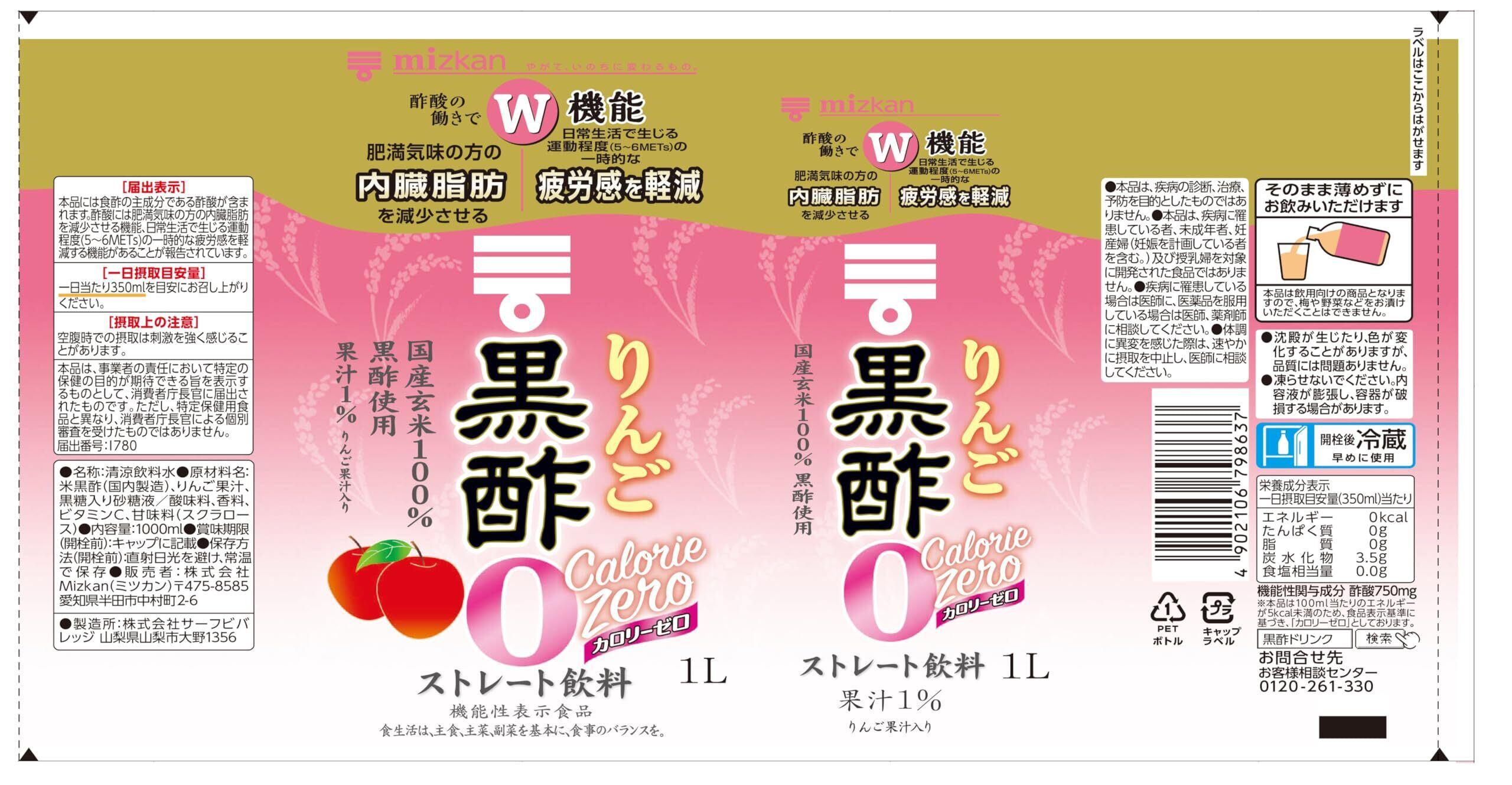 原材料:米黒酢(国内製造)、りんご果汁、黒糖入り砂糖液/酸味料、香料、ビタミンC、甘味料(スクラロース)