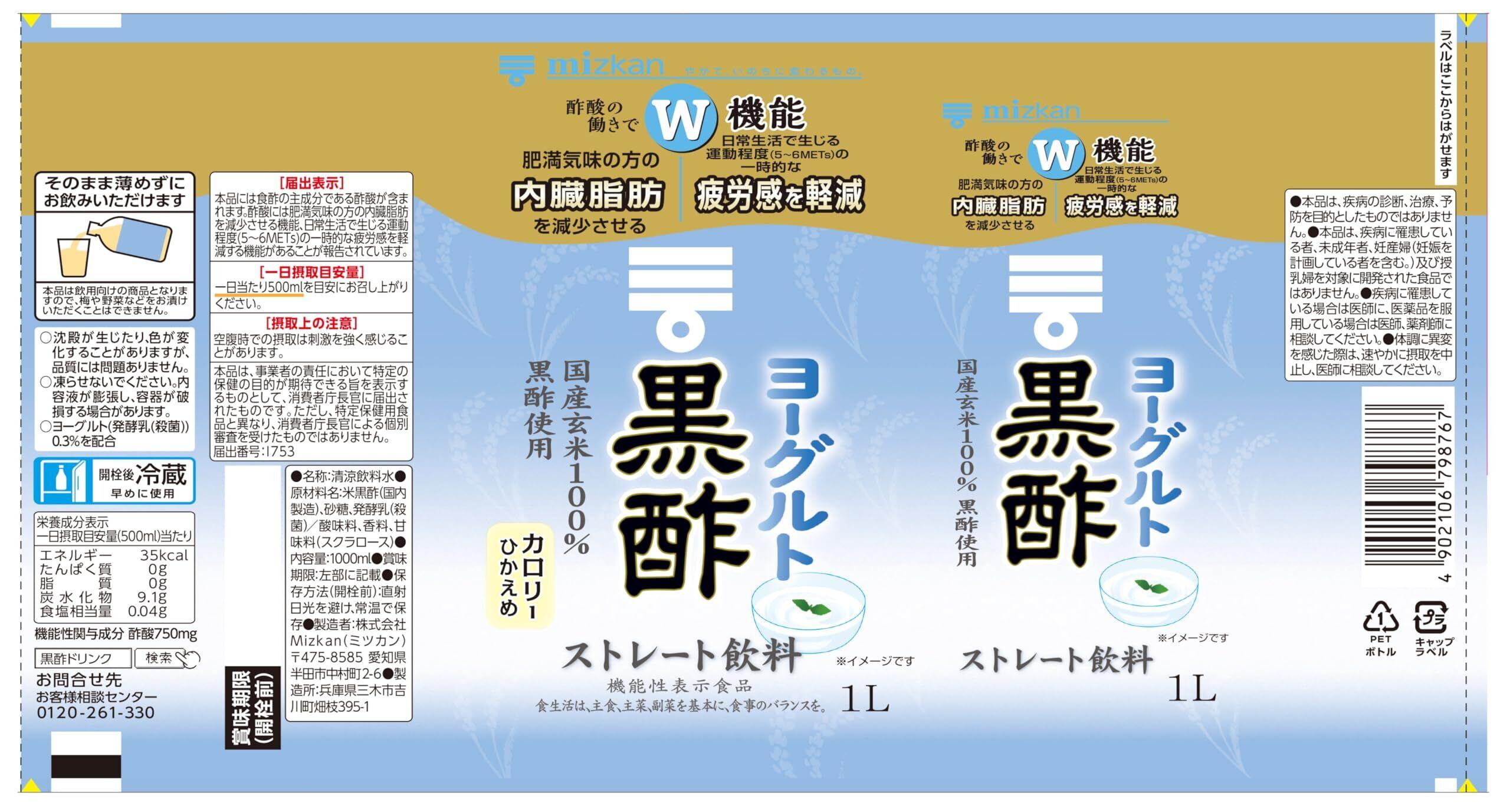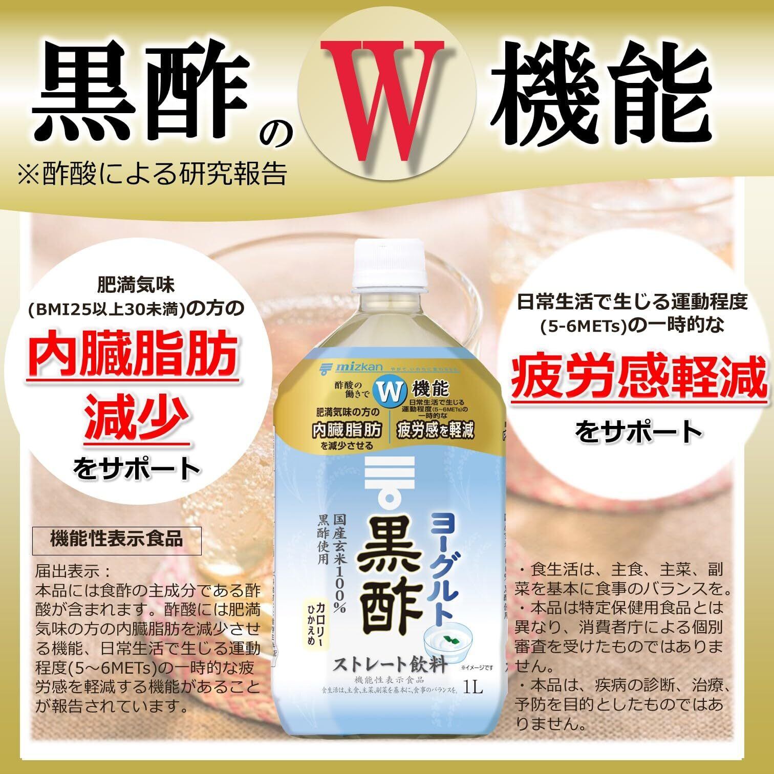国産玄米を100%使って醸造した黒酢に、ヨーグルト(発酵乳)を加えて飲みやすく仕上げた、おいしく黒酢をとることができる黒酢飲料(黒酢ドリンク、お酢ドリンク、ビネガードリンク、飲むお酢、飲む酢、酢飲料)です。そのまま飲めるストレートタイプです。本品は酢酸が含まれているため、肥満気味で内臓脂肪が気になる方・日常生活で生じる運動程度の一時的な疲労感を感じる方に適した機能性表示食品です。本品500mlに食酢(黒酢)の主成分である酢酸750mgを含んでいます。●届出表示:本品には食酢の主成分である酢酸が含まれます。酢酸には肥満気味の方の内臓脂肪を減少させる機能、日常生活で生じる運動程度(5~6METs)の一時的な疲労感を軽減する機能があることが報告されています。●一日摂取目安量・摂取の方法:1日当たり500mlを目安にお召し上がりください。