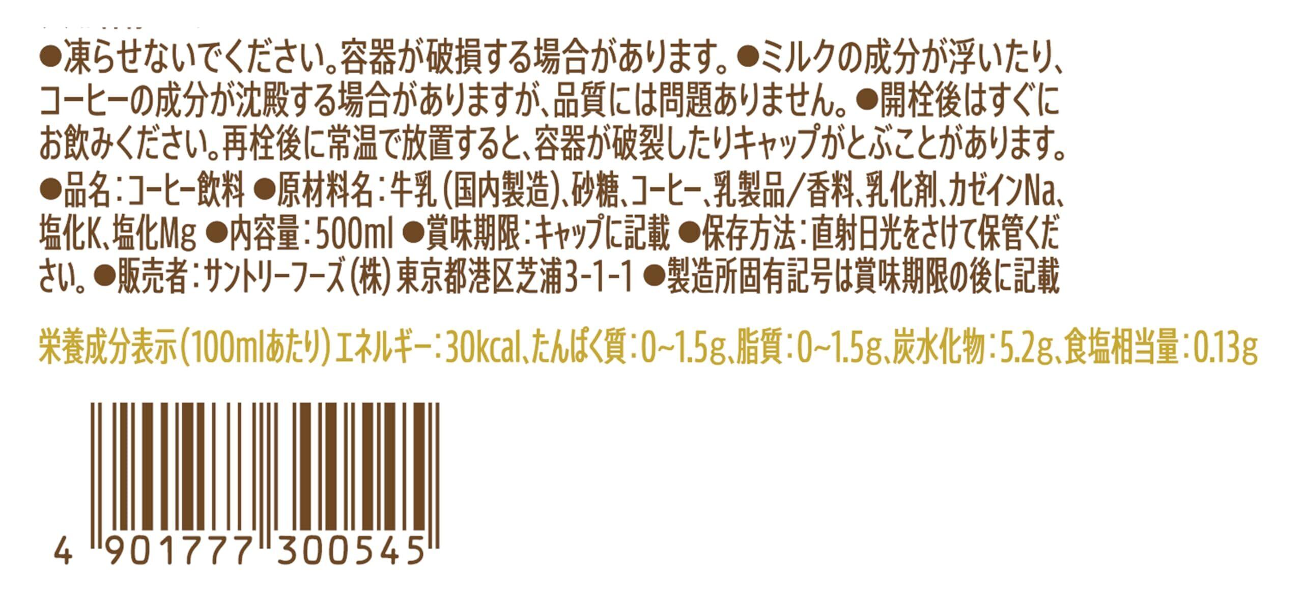 原材料:牛乳(国内製造)、砂糖、コーヒー、乳製品、香料、乳化剤、カゼインNa、塩化K 、塩化Mg