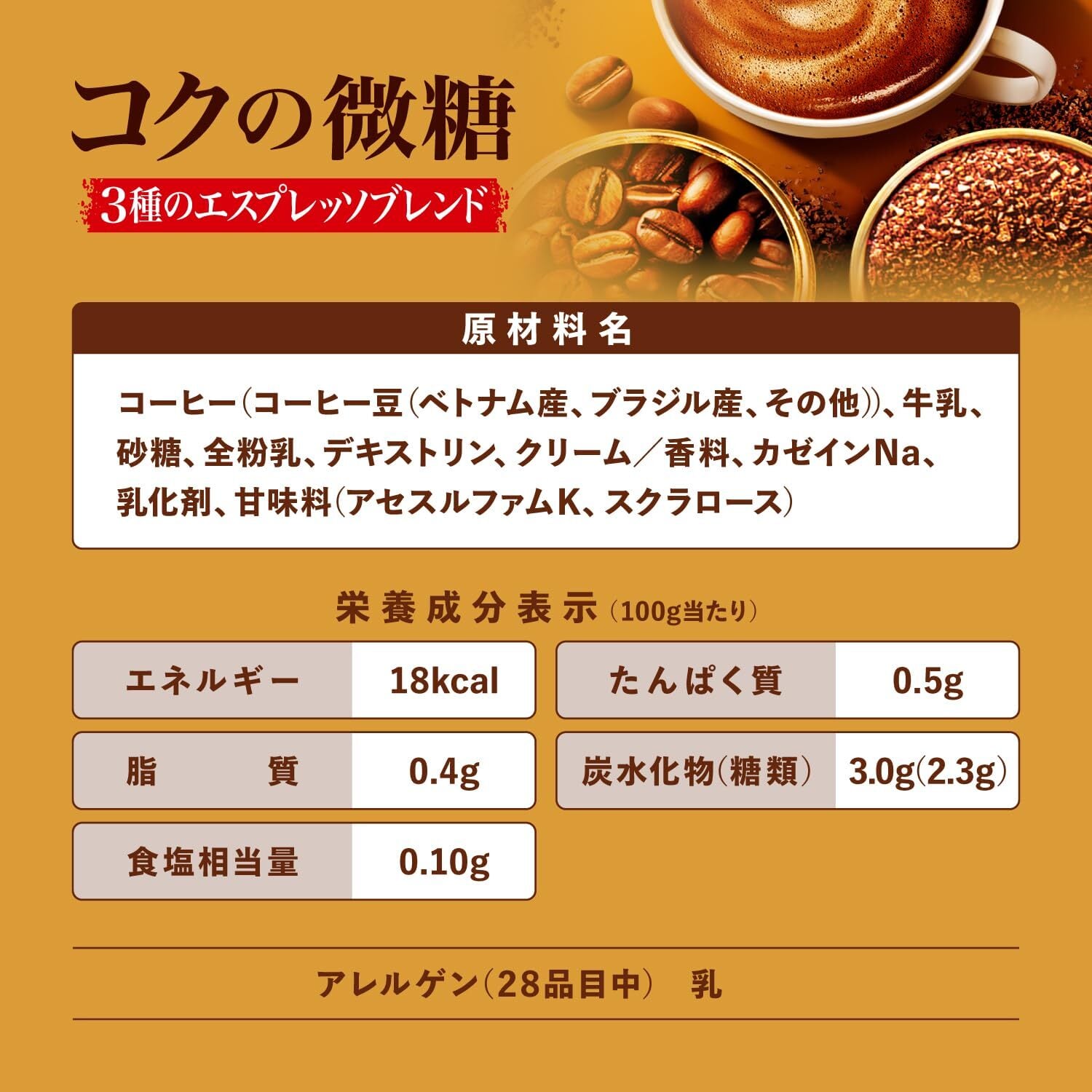 コーヒー(コーヒー豆(ベトナム産、ブラジル産、その他))、牛乳、砂糖、全粉乳、デキストリン、クリーム/香料、カゼインNa、乳化剤、甘味料(アセスルファムK、スクラロース)