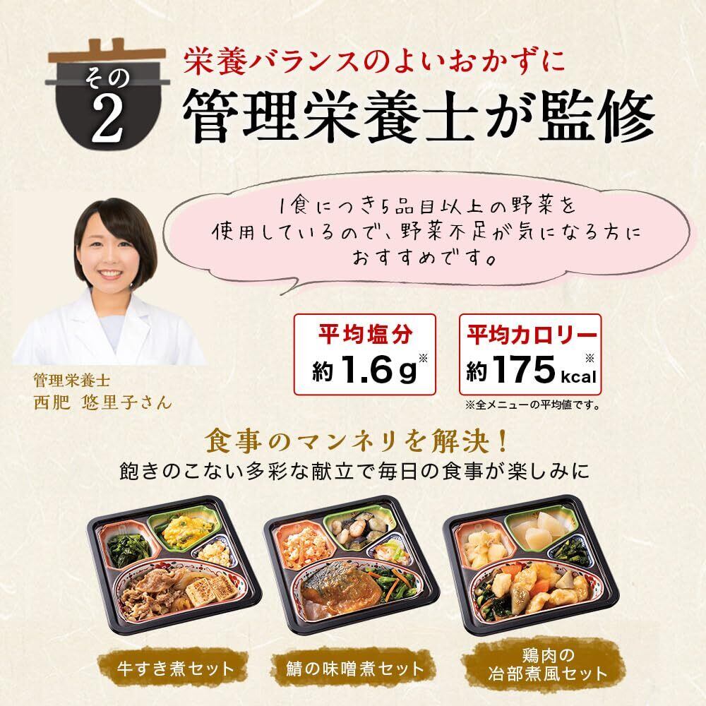【健康バランスを考えた献立】管理栄養士監修で副菜メニューも充実。健康に気遣って、野菜を1食あたり平均5品目使用。栄養バランスを考えたおかずで健やかな食生活にお役立ていただけます。塩分も控えめ、カロリーも1食当たり平均約175kcalとヘルシーなおかずセットです。