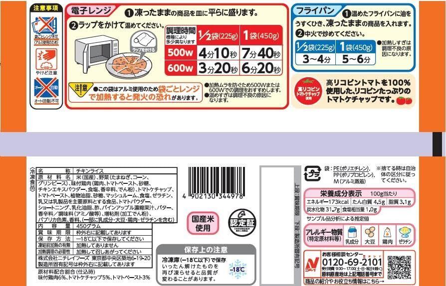 米(国産)、野菜(たまねぎ、コーン、グリンピース)、味付鶏肉(鶏肉、トマトペースト、砂糖、チキンエキスパウダー、食塩、香辛料、でん粉)、トマトケチャップ、トマトペースト、植物油脂、砂糖、マッシュルーム、食塩、ゼラチン、乳又は乳製品を主要原料とする食品、トマトパウダー、ショートニング、乳化油脂、酢、パインアップル濃縮果汁、バター、香辛料/調味料(アミノ酸等)、増粘剤(加工でん粉)、パプリカ色素、香料、(一部に乳成分・大豆・鶏肉・ゼラチンを含む)