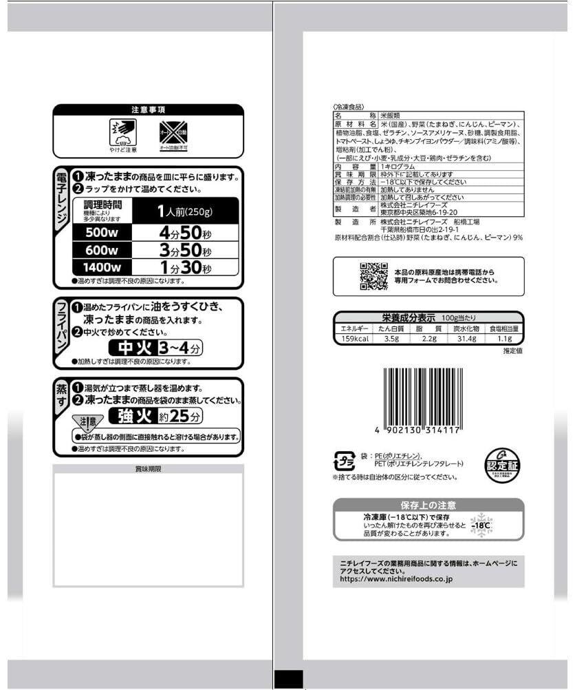 米(国産)、野菜(たまねぎ、にんじん、ピーマン)、植物油脂、食塩、ゼラチン、ソースアメリケーヌ、砂糖、調製食用脂、トマトペースト、しょうゆ、チキンブイヨンパウダー/調味料(アミノ酸等)、増粘剤(加工でん粉)、(一部にえび・小麦・乳成分・大豆・鶏肉・ゼラチンを含む)