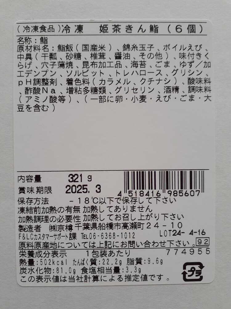 鮨飯(国産米)、錦糸玉子、ボイルえび、中具(干瓢、砂糖、椎茸、醤油、その他)、味付きくらげ、穴子蒲焼、昆布加工品、海苔、ごま、ゆず/加工デンプン、ソルビット、トレハロース、グリシン、pH調整剤、着色料(カラメル、クチナシ)、酸味料、酢酸Na、増粘多糖類、グリセリン、酒精、調味料(アミノ酸等)、(一部に卵・小麦・えび・ごま・大豆を含む)