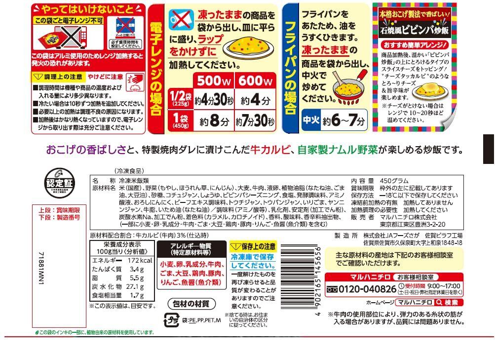 原材料:米(日本)、野菜(もやし、ほうれん草、にんじん)、大麦、液卵、牛肉、植物油脂(なたね油、ごま油、大豆油)、糖類(砂糖、ぶどう糖)、コチュジャン、しょうゆ、牛脂、ビビンバシーズニング、発酵調味料、食塩、濃縮りんご果汁、おろしにんにく、いりごま、トウチジャン、トウバンジャン、ヤンニンジャン、いため油(なたね油)/調味料(アミノ酸等)、安定剤(加工でん粉)、乳化剤、炭酸水素Na、加工でん粉、香料、着色料(カロチノイド、カラメル)、酸味料、香辛料抽出物、(一部に小麦・卵・乳成分・牛肉・ごま・大豆・鶏肉・豚肉・りんご・魚醤(魚介類)を含む)