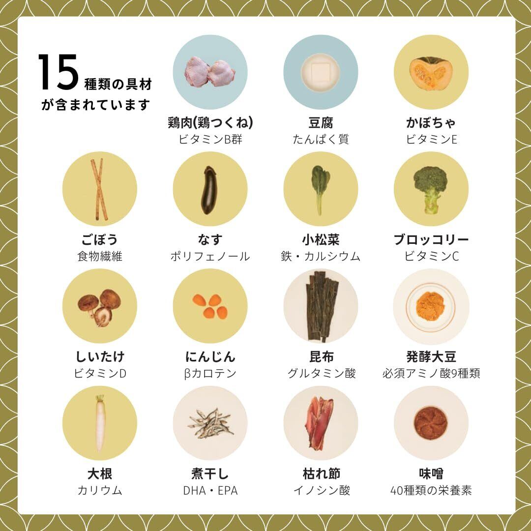 ✨15種類の具材を贅沢に使用:かぼちゃ、なす、小松菜、しいたけ、ブロッコリーなどの野菜や豆腐など15種類の具材を贅沢に使用しており、国産の煮干しを中心とした風味豊かな出汁に味噌・枯節といった発酵食品をブレンドしました。