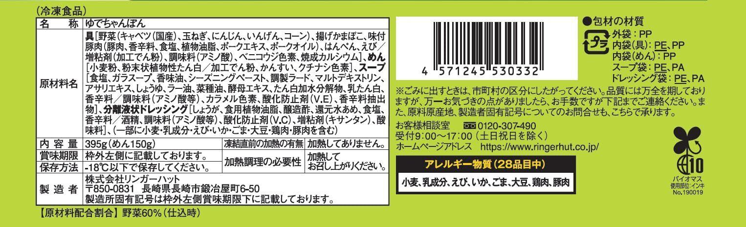 具 [野菜(キャベツ(国産)、玉ねぎ、にんじん、いんげん、コーン)、揚げかまぼこ、味付豚肉(豚肉、香辛料、食塩、植物油脂、ポークエキス、ポークオイル)、はんぺん、えび/増粘剤(加工でん粉)、調味料(アミノ酸)、ベニコウジ色素、焼成カルシウム] めん [小麦粉、粉末状植物性たん白/加工でん粉、かんすい、クチナシ色素] スープ[食塩、ガラスープ、香味油、シーズニングペースト、調製ラード、マルトデキストリン、アサリエキス、しょうゆ、ラー油、菜種油、酵母エキス、たん白加水分解物、乳たん白、香辛料/調味料(アミノ酸等)、カラメル色素、酸化防止剤(V.E)、香辛料抽出物]分離液状ドレッシング [しょうが、食用植物油脂、醸造酢、還元水あめ、食塩、香辛料/酒精、調味料(アミノ酸等)、酸化防止剤(ビタミンC)、増粘剤(キサンタン)、酸味料]、(一部に小麦・乳成分・えび・いか・ごま・大豆・鶏肉・豚肉を含む)