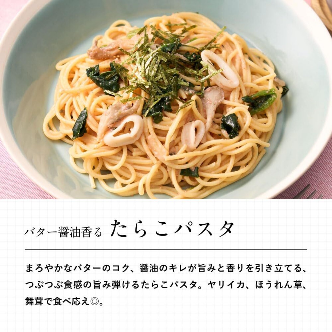 まろやかなバターのコクと醤油のキレが旨みと香りを引き立てる、粒立ち豊かなたらこパスタ!ヤリイカ、ほうれん草、舞茸、刻みのり入り!