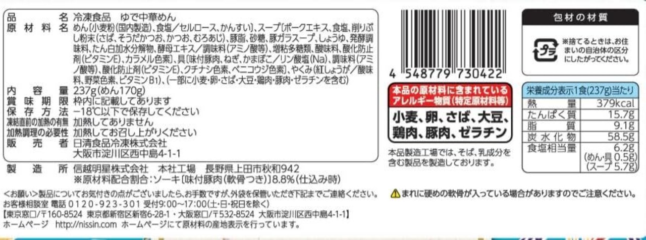 めん〔小麦粉(国内製造)、食塩/セルロース、かんすい〕、スープ〔ポークエキス、食塩、削りぶし粉末(さば、そうだかつお、かつお、むろあじ)、豚脂、砂糖、豚ガラスープ、しょうゆ、発酵調味料、たん白加水分解物、酵母エキス/調味料(アミノ酸等)、増粘多糖類、酸味料、酸化防止剤(ビタミンE)、カラメル色素〕、具〔味付豚肉、ねぎ、かまぼこ/加工でん粉、調味料(アミノ酸等)、リン酸塩(Na)、酸化防止剤(ビタミンE)〕、やくみ(紅しょうが/酸味料、野菜色素、ビタミンB1)、(一部に小麦・卵・さば・大豆・鶏肉・豚肉・ゼラチンを含む)