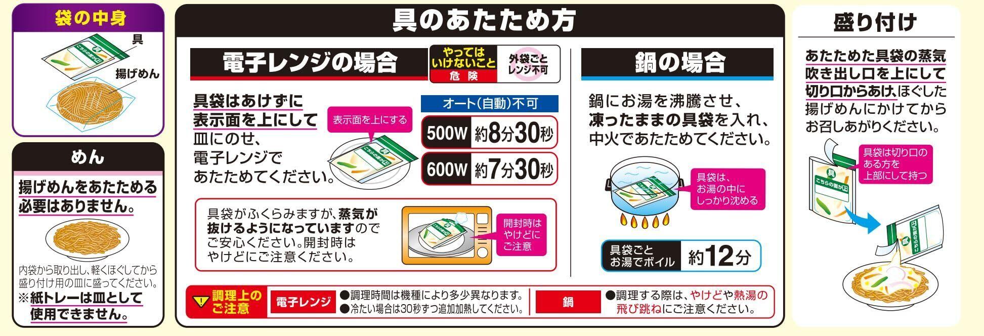 具〔野菜(キャベツ、にんじん、ほうれん草、もやし、コーン)、でん粉、魚肉(いか、えび)、ポークエキス、豚肉、砂糖、かまぼこ、きくらげ、清酒、食塩、植物油脂、ラード、しょうゆ、かきエキス調味料、デキストリン、たん白加水分解物、チキンエキス、香辛料/調味料(アミノ酸等)、増粘剤(キサンタン)、加工でん粉、pH調整剤、着色料(クチナシ、トマトリコピン)、酸味料〕、揚げめん(国内製造)〔小麦粉、植物油脂、食塩/かんすい、カロチノイド色素、酸化防止剤(V.E)〕、(一部にえび・小麦・いか・ごま・大豆・鶏肉・豚肉・ゼラチンを含む)