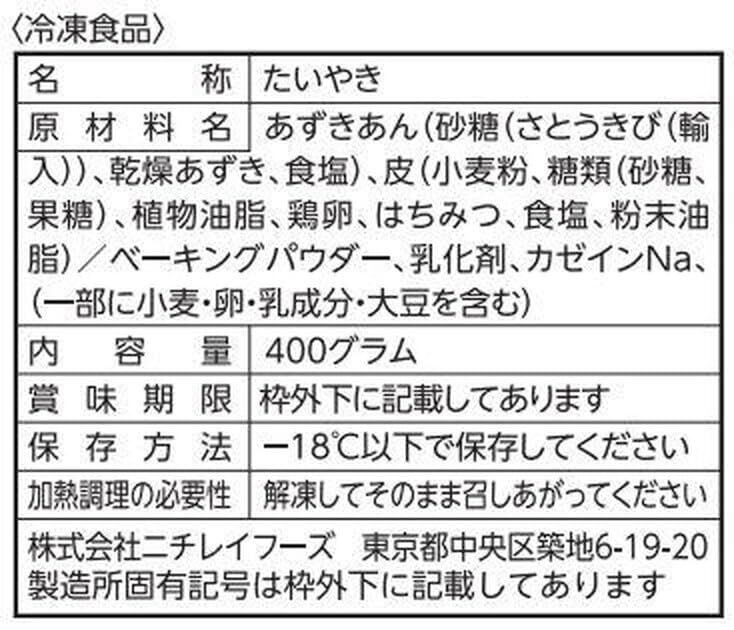 あずきあん(砂糖(さとうきび(輸入))、乾燥あずき、食塩)、皮(小麦粉、鶏卵、糖類(砂糖、果糖)、植物油脂、はちみつ、食塩、粉末油脂)/ベーキングパウダー、乳化剤、カゼインNa、(一部に小麦・卵・乳成分・大豆を含む)