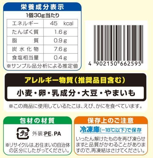 たこ焼き:野菜(キャベツ(国産)、ねぎ)、小麦粉、たこ、還元水あめ、紅しょうが、揚げ玉、やまいも、植物油脂、全卵、砂糖、食塩、こんぶエキス、風味調味料(かつお)、かつお節粉末、コーンシロップ、ぶどう糖、加工油脂/加工でん粉、調味料(アミノ酸等)、ベーキングパウダー、増粘剤(キサンタン)、乳化剤、紅麹色素、炭酸Na、(一部に小麦・卵・乳成分・大豆・やまいもを含む)ソース:野菜・果実(トマト、たまねぎ、りんご、デーツ、その他)、糖類(砂糖、ぶどう糖果糖液糖)、醸造酢、アミノ酸液、しょうゆ、食塩、酒精、ウスターソース、香辛料、オイスターエキス、こんぶエキス、酵母エキス、肉エキス、たん白加水分解物、魚肉エキス、ホタテエキス/増粘剤(加工でん粉、増粘多糖類)、調味料(アミノ酸等)、カラメル色素、(一部に小麦・大豆・鶏肉・豚肉・もも・りんごを含む)