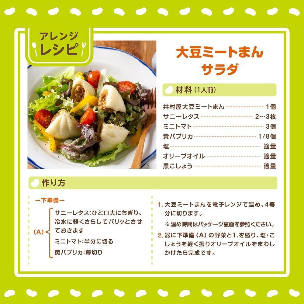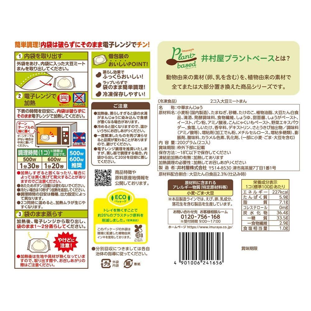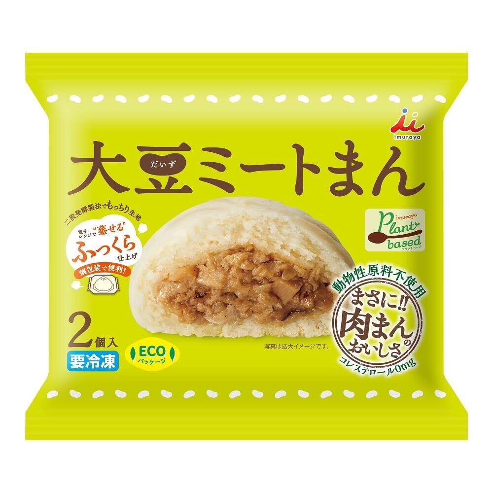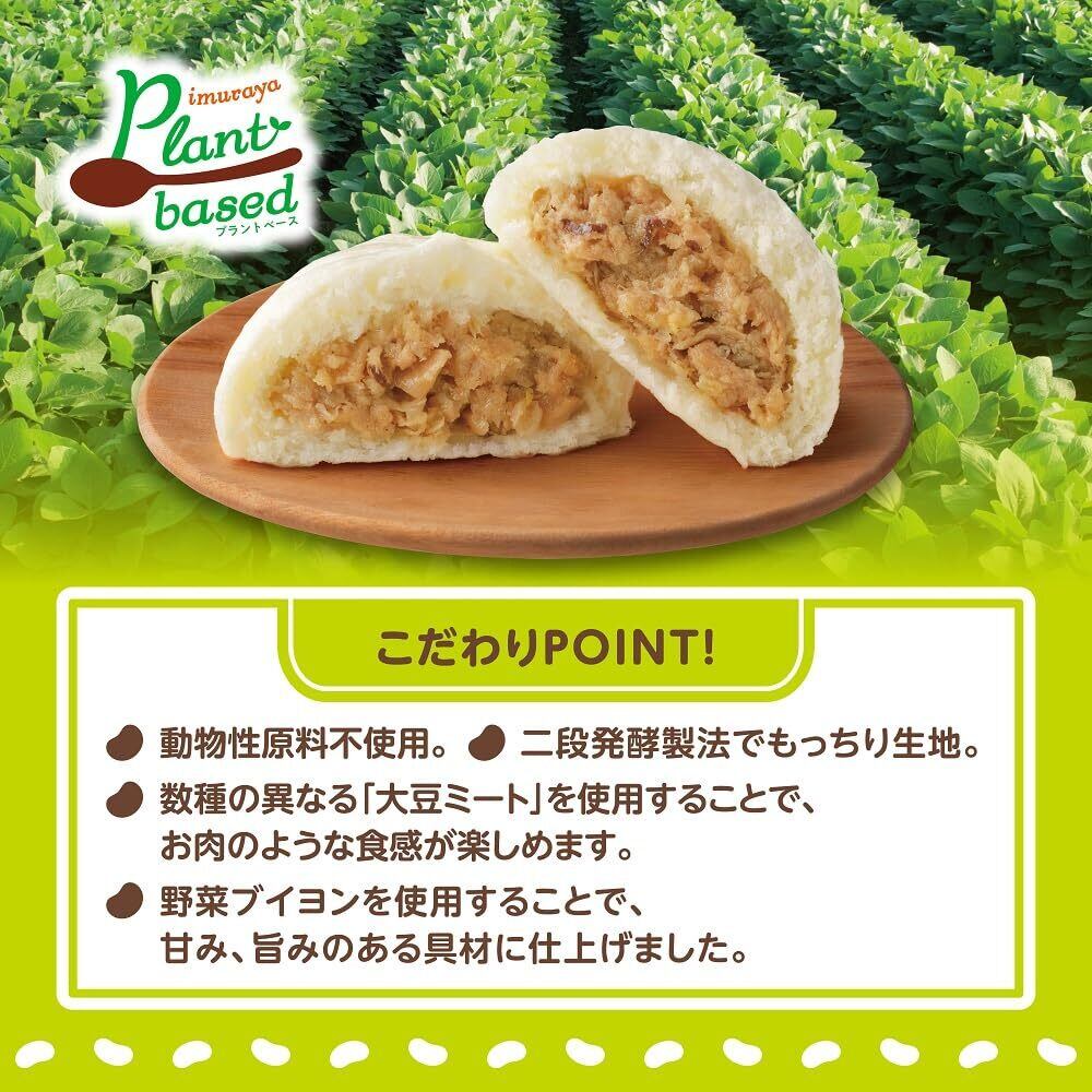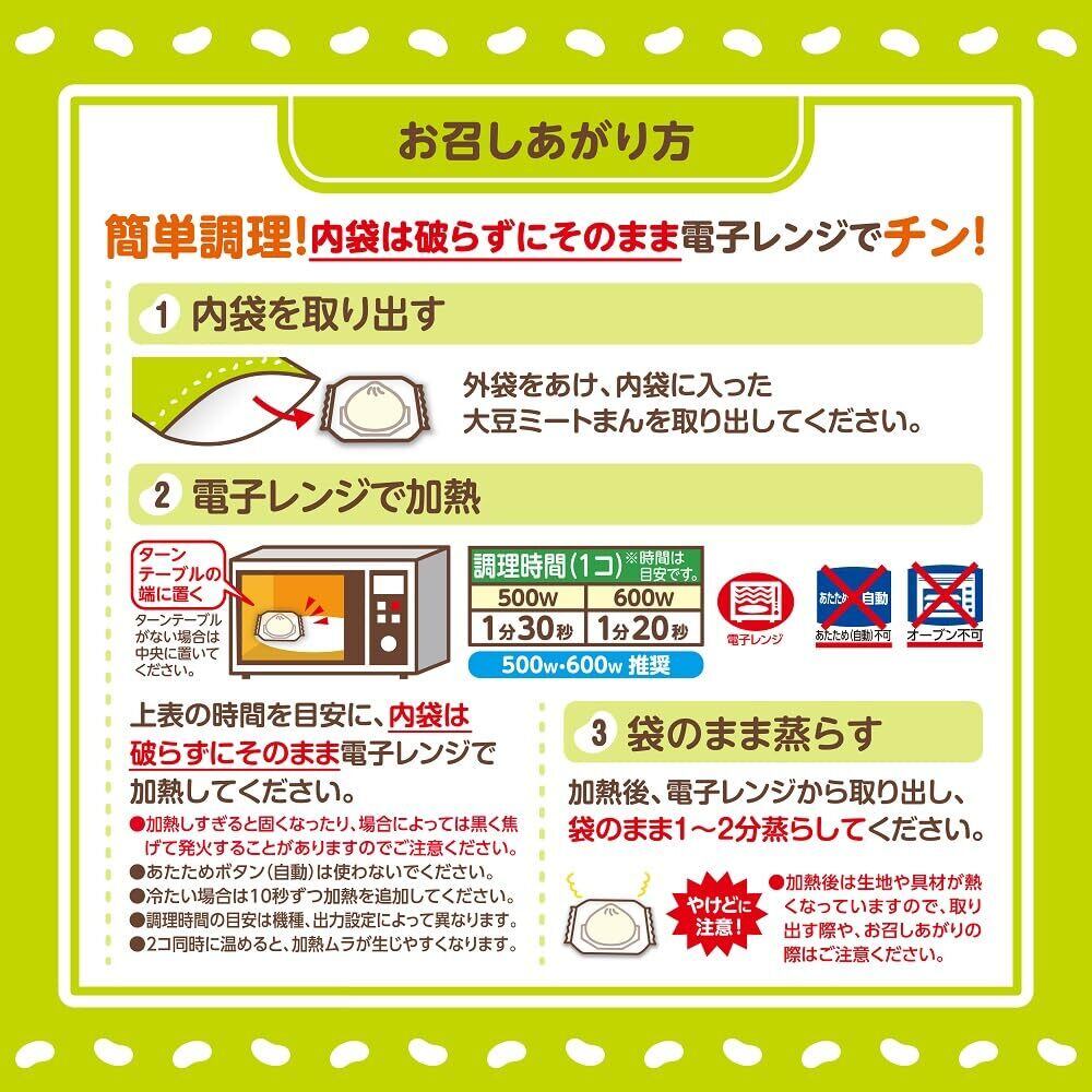 植物性原料を一切使用せず「大豆ミート」で作りました。数種の異なる「大豆ミート」を使用することで、お肉のような食感が楽しめます。野菜ブイヨン、タケノコ、椎茸、たまねぎを使用し、野菜の食感と甘み・旨みのある具材に仕上げました。当社肉まんのおいしさはそのままに、豚肉を植物由来の大豆に置き換え、動物性原料を一切使用しないことで、健康志向のお客様にもお楽しみいただけます。個包装の袋のまま電子レンジで手軽に調理できます。トレイを使わないECOパッケージです。