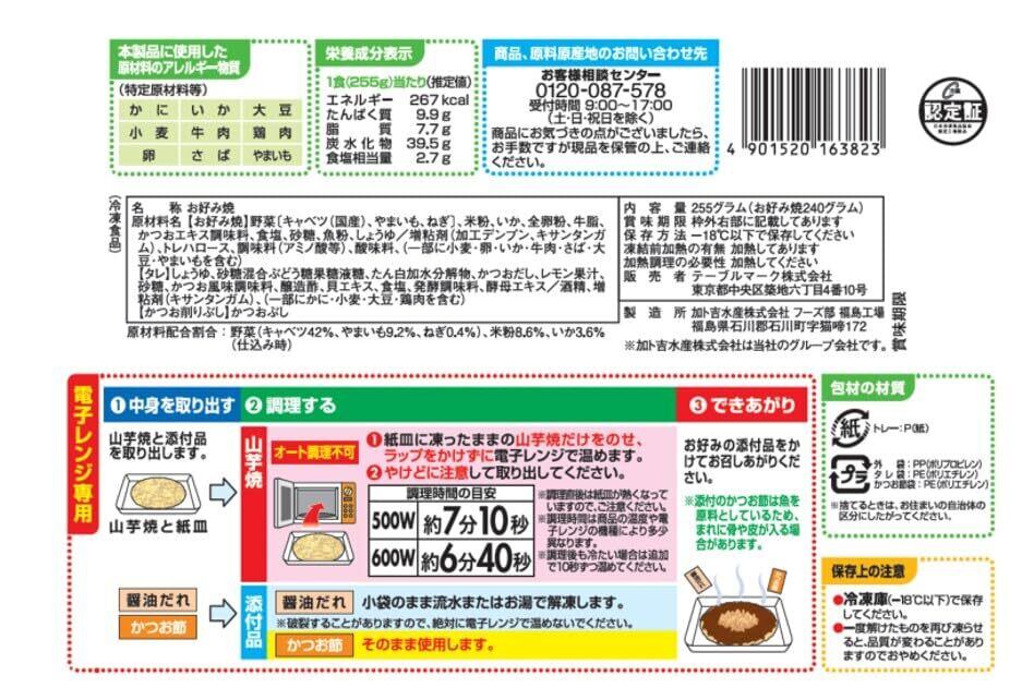 【お好み焼】野菜〔キャベツ(国産)、やまいも、ねぎ〕、米粉、いか、全卵粉 、牛脂、かつおエキス調味料、食塩、砂糖、魚粉、しょうゆ/増粘剤(加工デン プン、キサンタンガム)、トレハロース、調味料(アミノ酸等)、酸味料、(一 部に小麦・卵・いか・牛肉・さば・大豆・やまいもを含む) 【タレ】しょうゆ、砂糖混合ぶどう糖果糖液糖、たん白加水分解物、かつおだし 、レモン果汁、砂糖、かつお風味調味料、醸造酢、貝エキス、食塩、発酵調味料 、酵母エキス/酒精、増粘剤(キサンタンガム)、(一部にかに・小麦・大豆・ 鶏肉を含む) 【かつお削りぶし】かつおぶし