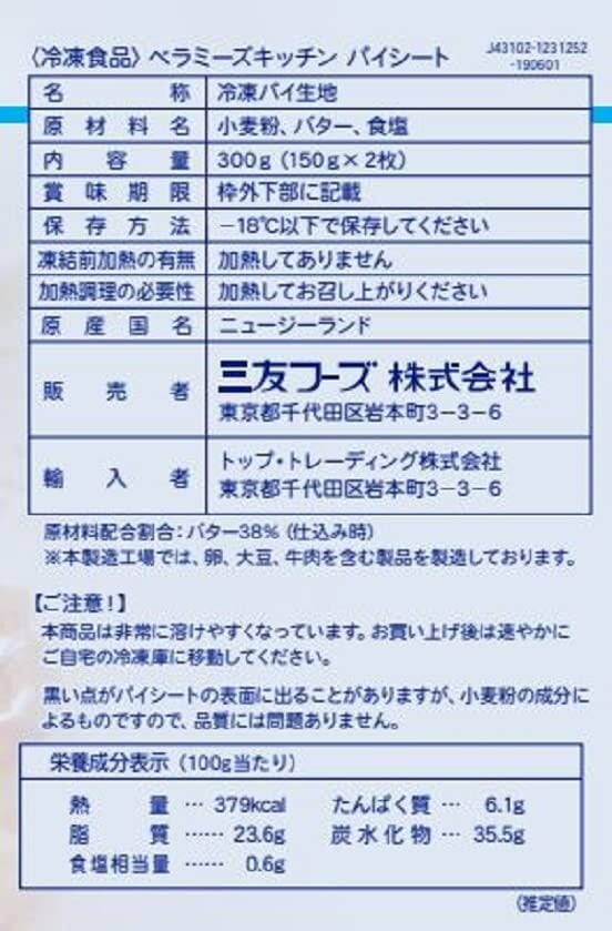 料理雑誌などで紹介され根強い人気を誇る当社のロングセラー商品です。小麦粉、バター、食塩でできたシンプルなパイシートです。バターのコクと香りが楽しめます。①原材料は小麦粉、バター、水、食塩のみ! 一般的な国内製造品は乳化剤や香料、色素などの食品添加物が使用されており、またバターが数パーセントで大半がマーガリンの商品ばかりです。バターの深いコクが違います。②プロに愛されて30年! さっくりと色よく主張しすぎないもののバターの深いコクと香りが特徴で、専門店や料理研究家にも指名買いされる当社のロングセラー商品です。③酪農国ニュージーランドで製造!酪農国ニュージーランドの南島のインバーカーギルという小さな町にあるQFS社で製造されています。新鮮で良質な牛乳やバターを使い製品を作っています。