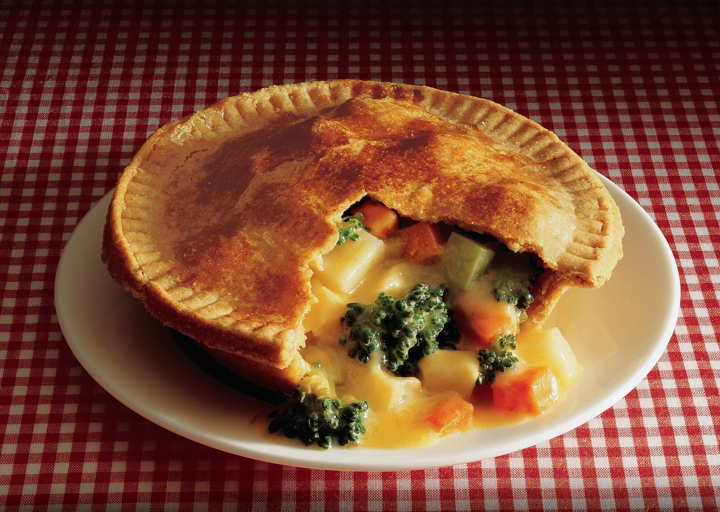 大きめに切ったブロッコリー、じゃがいも、にんじんが入ったシチューを全粒粉の生地で包み込みました。