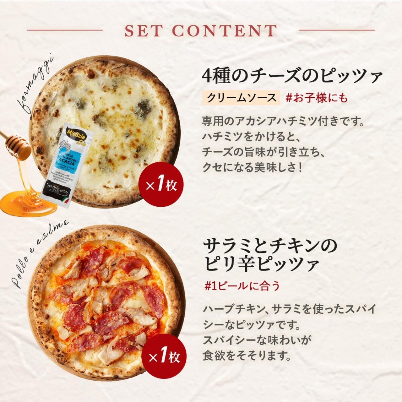 ■ プレミアムマルゲリータ:ピザ生地(小麦粉(国内製造)、食塩、パン酵母)、ナチュラルチーズ、トマトソース、食用調合油、バジル、食塩 / クエン酸、セルロース、卵白リゾチーム、(一部に卵・乳成分・小麦を含む)■ 4種のチーズのピッツァ~イタリア産BIOのハチミツ付~:ピザ生地(小麦粉(国内製造)、食塩、パン酵母)、ベシャメルソース、ナチュラルチーズ、乳等を主要原料とする製品、牛乳、食塩 / 乳化剤、安定剤(増粘多糖類)、メタリン酸Na、香料、セルロース、卵白リゾチーム、(一部に卵・乳成分・小麦を含む)