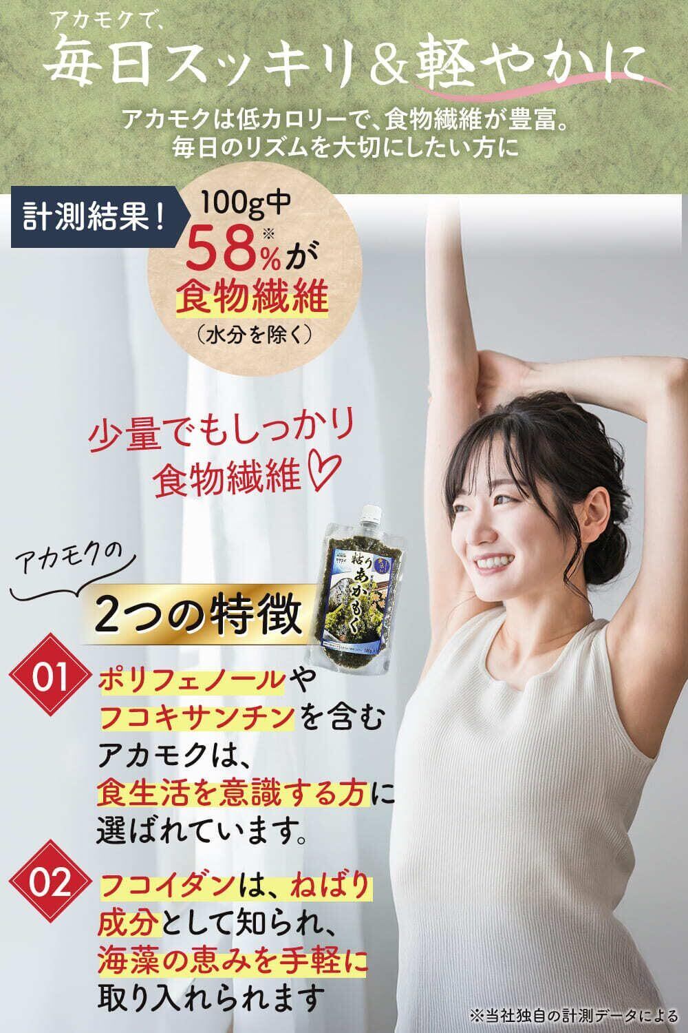 【ネバネバ&腸活サポート】徹底した水切りと二度挽き製法で粘りを凝縮したネバネバのアカモクは、腸活をサポートする食物繊維が100g中58%含まれることを自社測定で確認しています