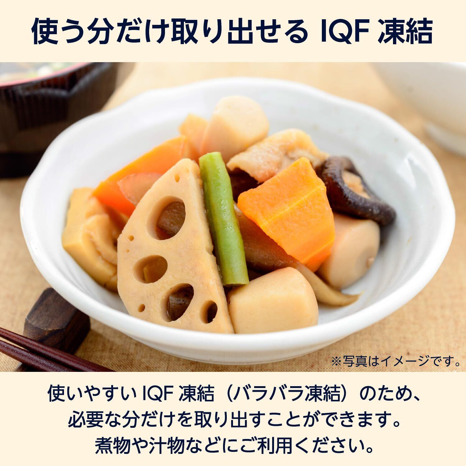 by 冷凍和風野菜ミックスは旬の時期に収穫されたさといも、れんこん、にんじん、しいたけ、たけのこ、いんげん、ごぼう、をミックスして冷凍しています。煮物や汁物にご利用いただけます。 1. IQF凍結なので、使いたい分だけを取り出してご利用いただけます。 2. 1kgの大容量 3. 旬の時期に収穫された色鮮やかな原料を、軽く湯通しして冷凍しています。 4. 指定の契約農場で栽培された原料を使用しており、産地から一貫した管理を行っております。