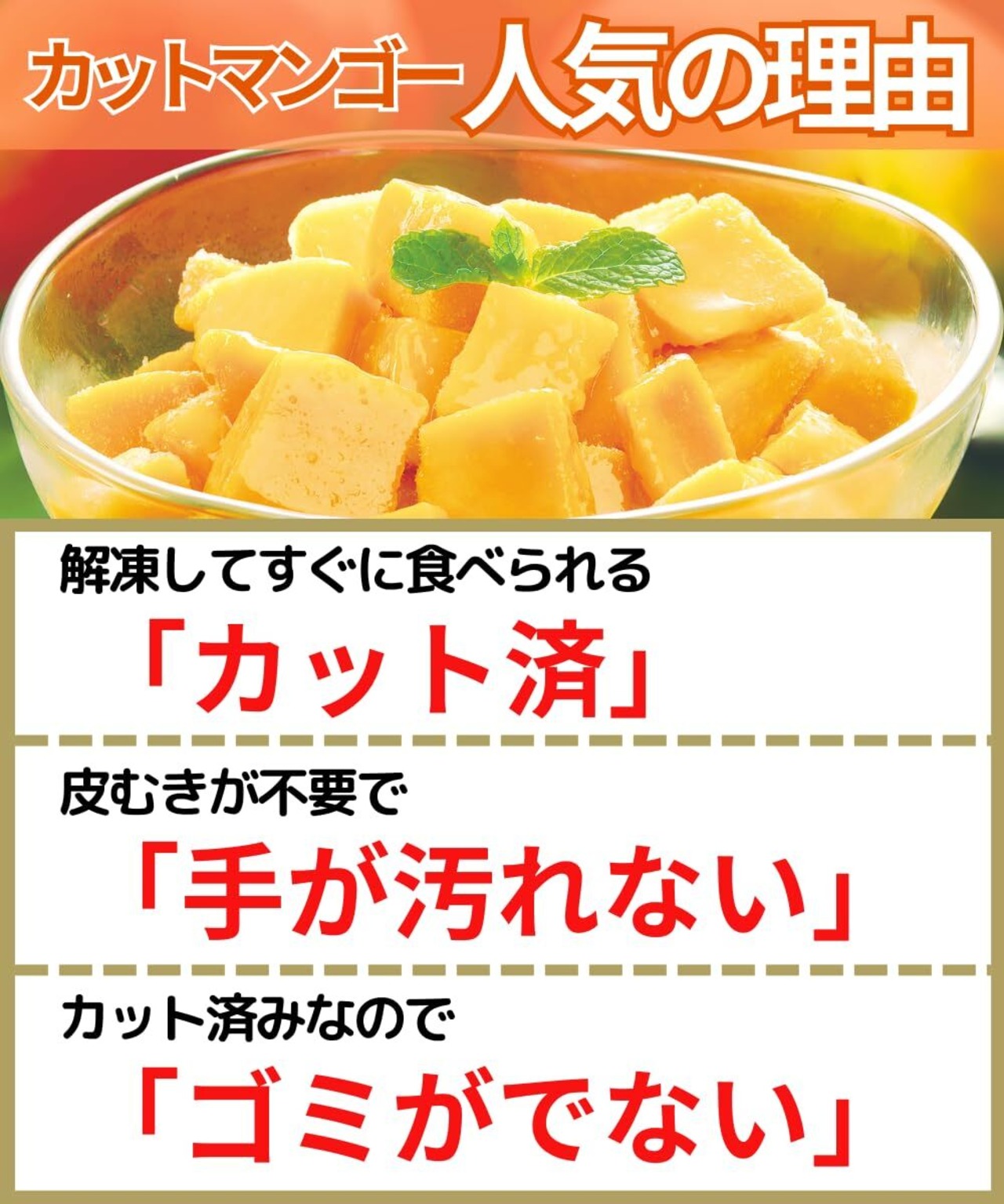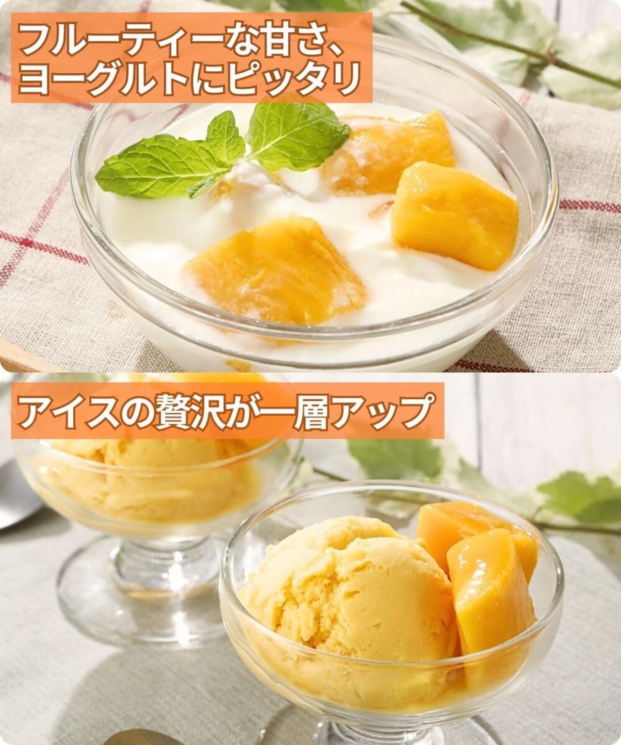 ヨーグルトに入れたり、スムージーにしたり、パフェやアイスのトッピングにも大活躍! そのまま食べても美味しい冷凍のマンゴー