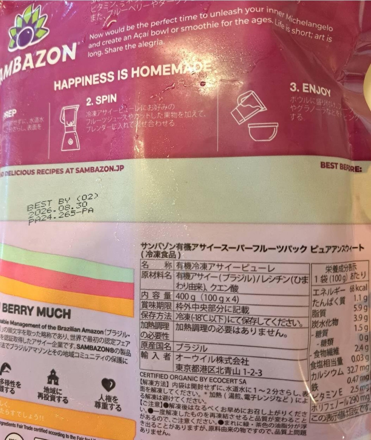 原材料・成分 有機アサイー/レシチン(ひ由来まわり)、クエン酸