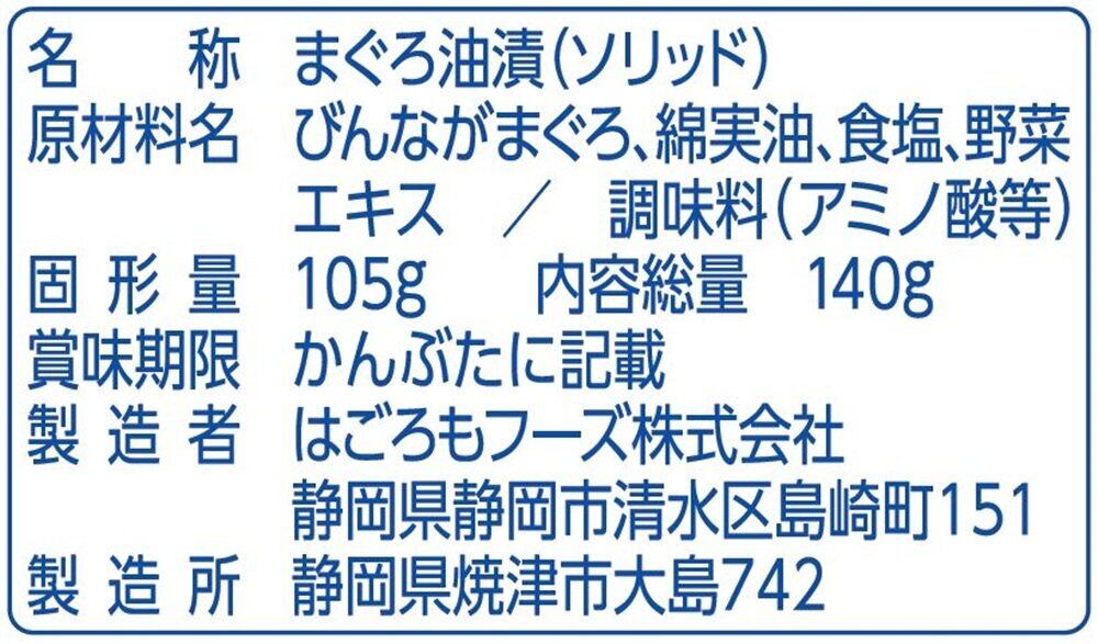 原材料:びんながまぐろ、綿実油、食塩、野菜エキス/調味料(アミノ酸等)