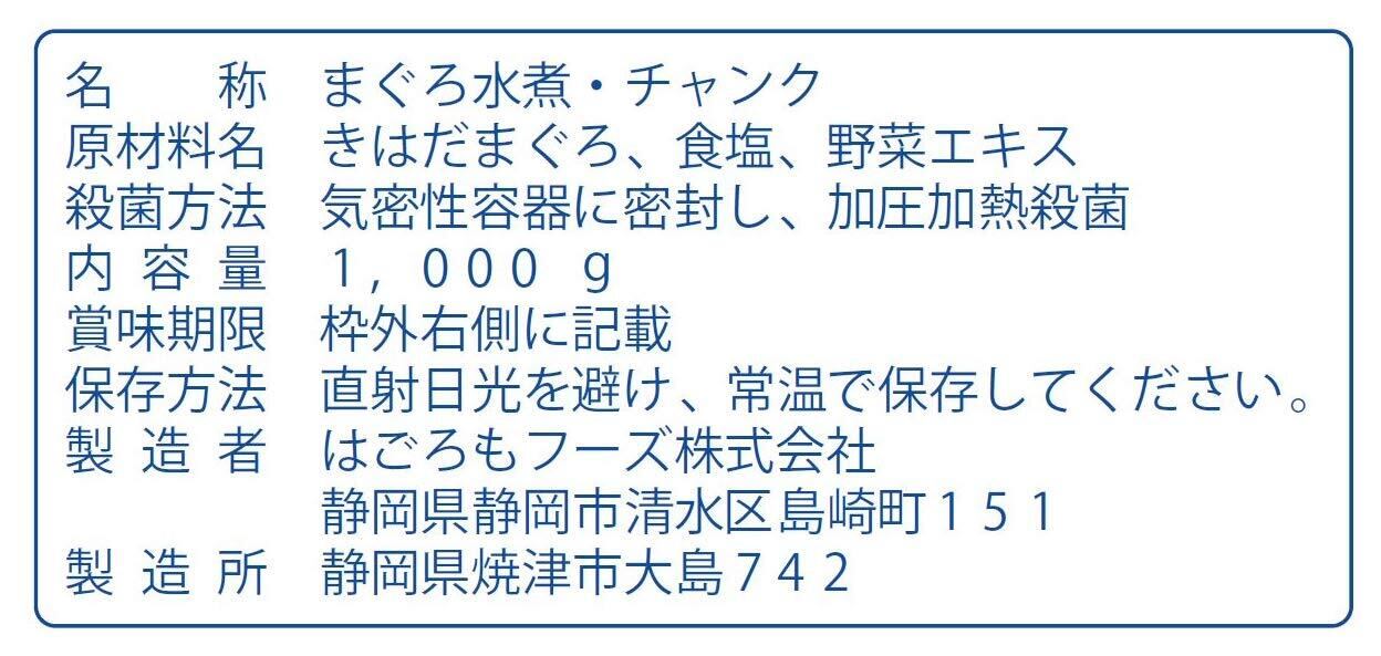 きはだまぐろをチャンク状にし、野菜スープで調味したオイル無添加タイプのシーチキンです。大容量1Kg入りの業務用製品です。