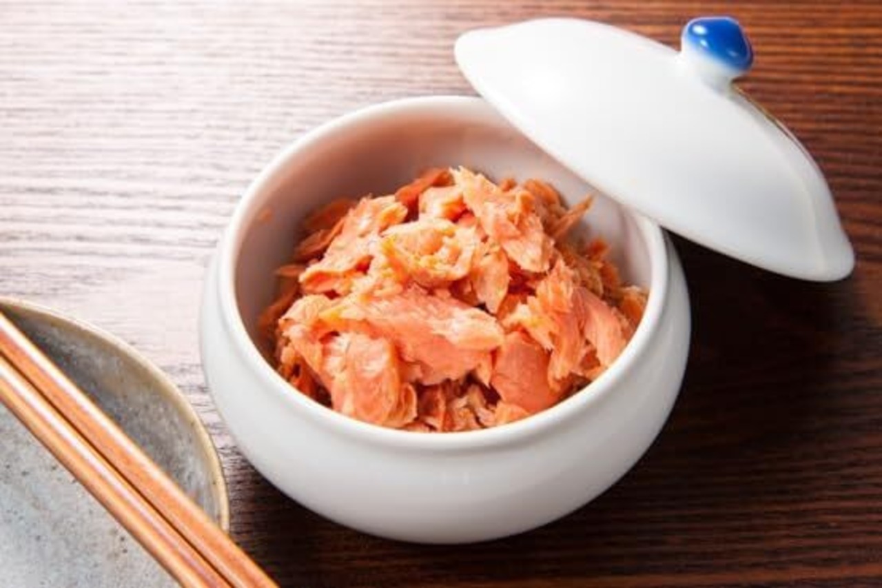 2日間漬け込み熟成し、うま味を最大限に引き出した紅鮭をじっくりと焼きあげ、荒ほぐしにしました。