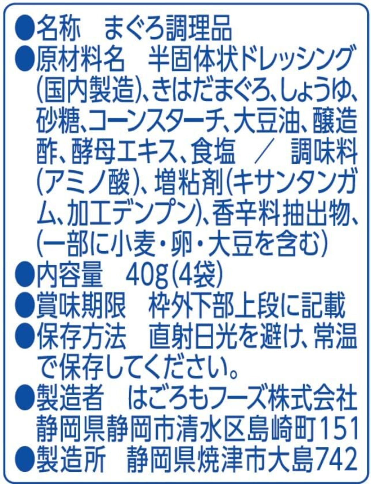 原材料:半固体状ドレッシング(国内製造)、きはだまぐろ、しょうゆ、砂糖、コーンスターチ、大豆油、醸造酢、酵母エキス、食塩 / 調味料(アミノ酸)、増粘剤(キサンタンガム、加工デンプン)、香辛料抽出物、(一部に卵・小麦・大豆を含む)