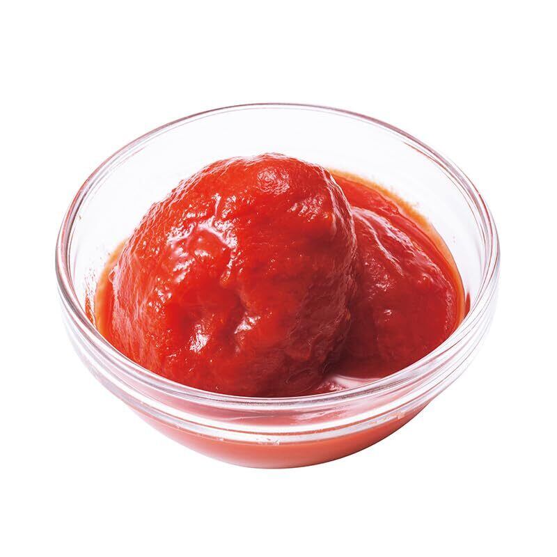 ソース用に最適といわれる、肉厚で酸味の少ないたて長タイプの完熟トマトを湯むきし、裏ごししたトマトジュースと一緒に缶詰にしました。