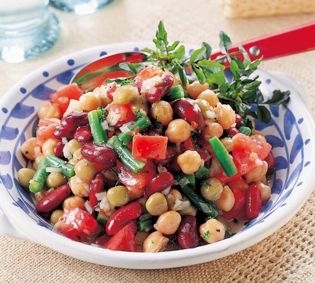 ガルバンゾー(ひよこ豆)、マローファットピース(青えんどう豆)、レッドキドニー(赤いんげん豆)の黄、緑、赤の3種類の豆をふっくら仕上げまして、ミックスして彩りのよく仕上げました。