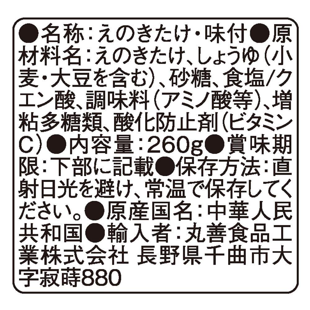えのきたけ、しょうゆ(小麦・大豆を含む)、砂糖、食塩/クエン酸、調味料(アミノ酸等)、増粘多糖類、酸化防止剤(ビタミンC)