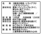 原材料:果実(パインアップル(タイ)、黄もも(南アフリカ)、みかん(中国))、砂糖・ぶどう糖果糖液糖/クエン酸