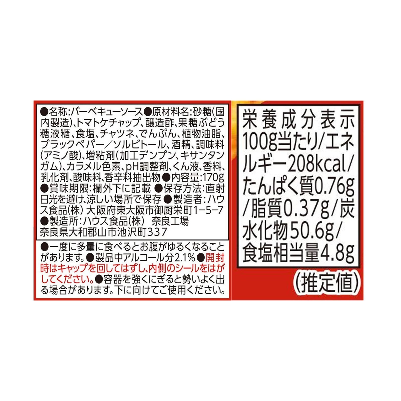砂糖(国内製造)、トマトケチャップ、醸造酢、果糖ぶどう糖液糖、食塩、チャツネ、でんぷん、植物油脂、ブラックペパー/ソルビトール、酒精、調味料(アミノ酸)、増粘剤(加工デンプン、キサンタンガム)、カラメル色素、pH調整剤、くん液、香料、乳化剤、酸味料、香辛料抽出物