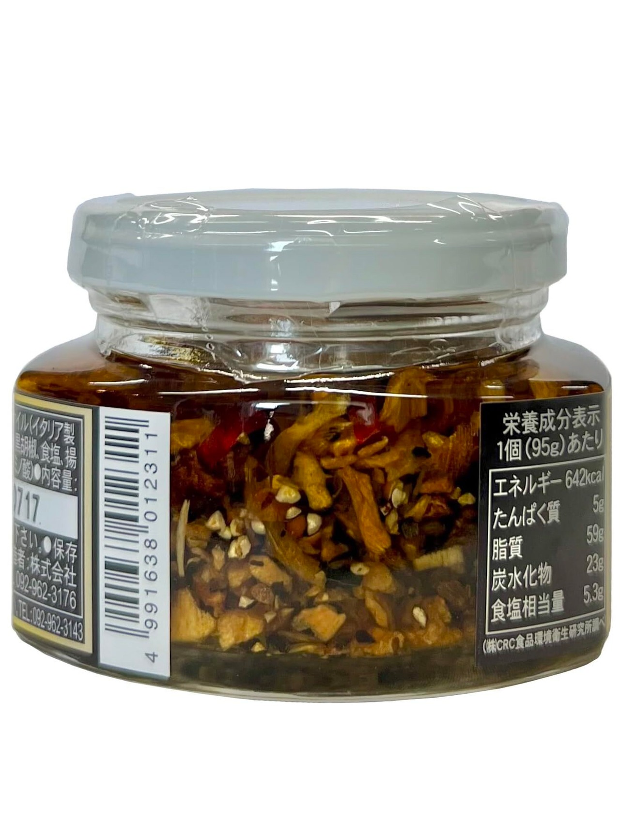 オリーブオイル(イタリア製造)、菜種油、揚げガーリック(小麦・大豆を含む)、トリュフ、黒コショウ、食塩、揚げオニオン、砂糖、発酵調味料、唐辛子、バジル/調味料(アミノ酸)